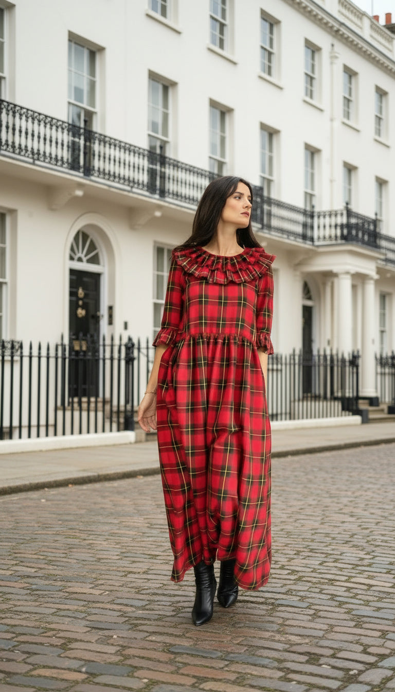 This striking red tartan dress features a wide double frill neckline, has a fitted waist and statement frilled edge sleeves. The dress is an easy-to-wear statement piece, that is handmade to order in Minkie's Camden studio.