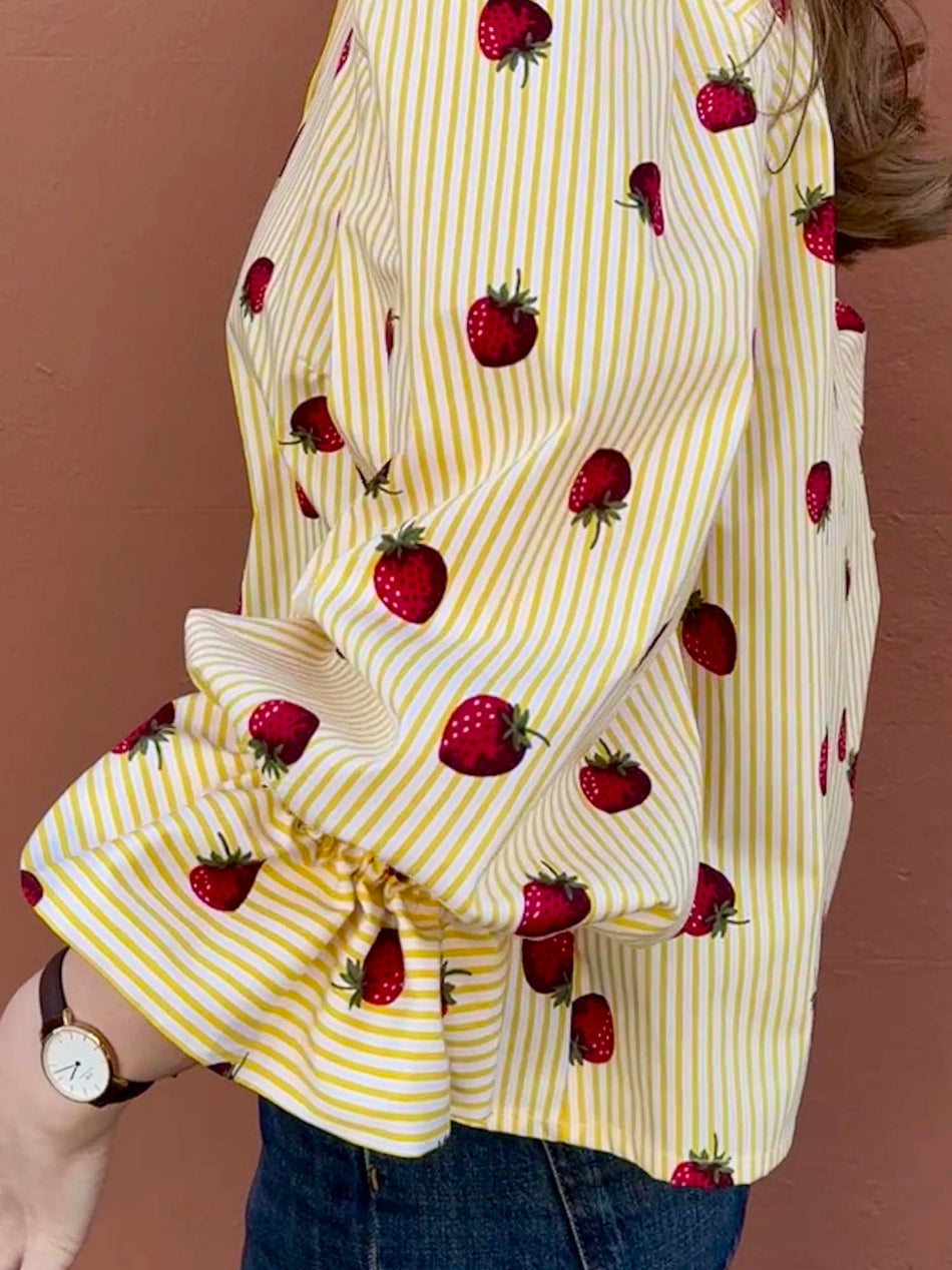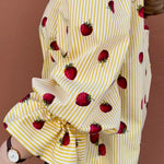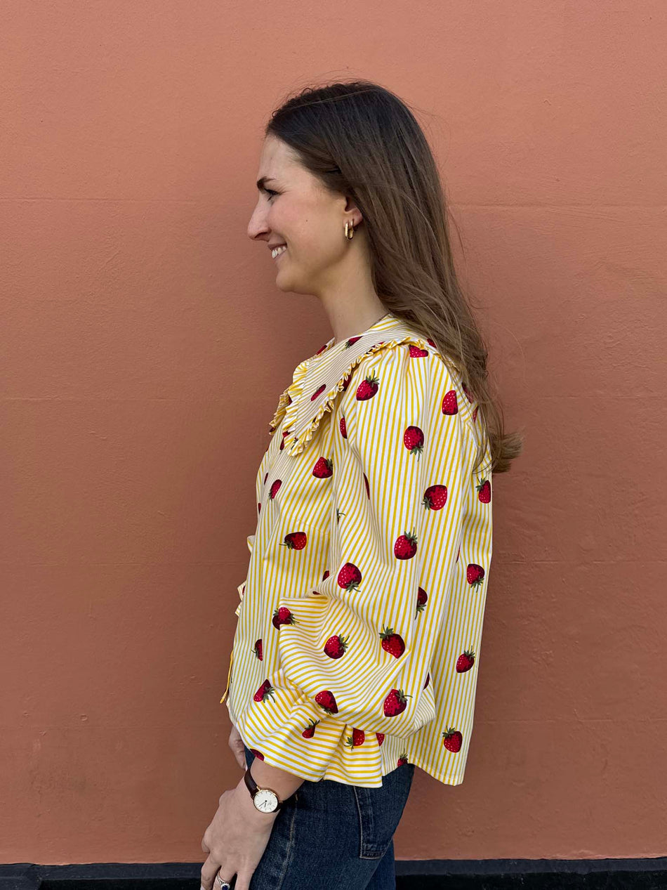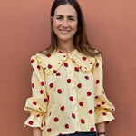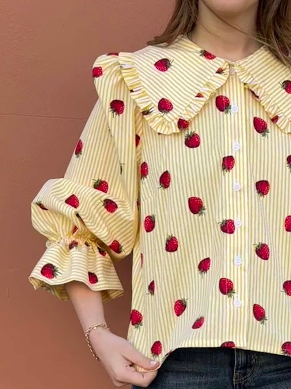 This Strawberry Print Cotton Luna Blouse is made from 100% breathable cotton and perfect for feeling comfortable, charming, and joyful every day. It has a lovely frill neckline, gathered sleeves, and a cheerful yellow stripe covered in hand-drawn strawberries, making it a must-have for effortless spring and summer style.