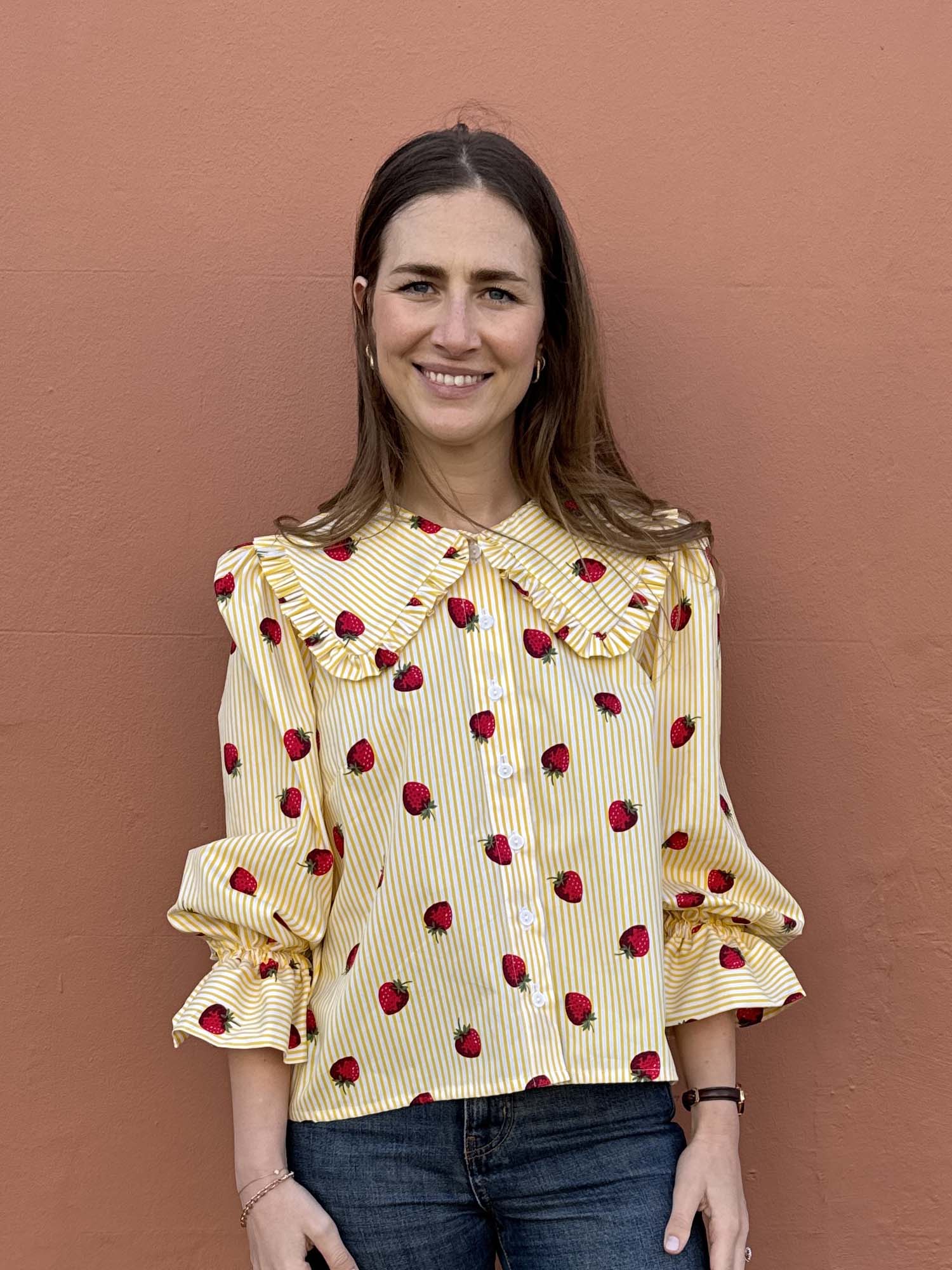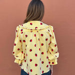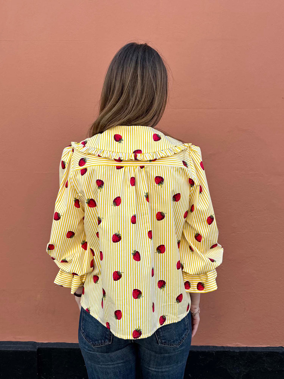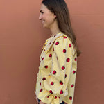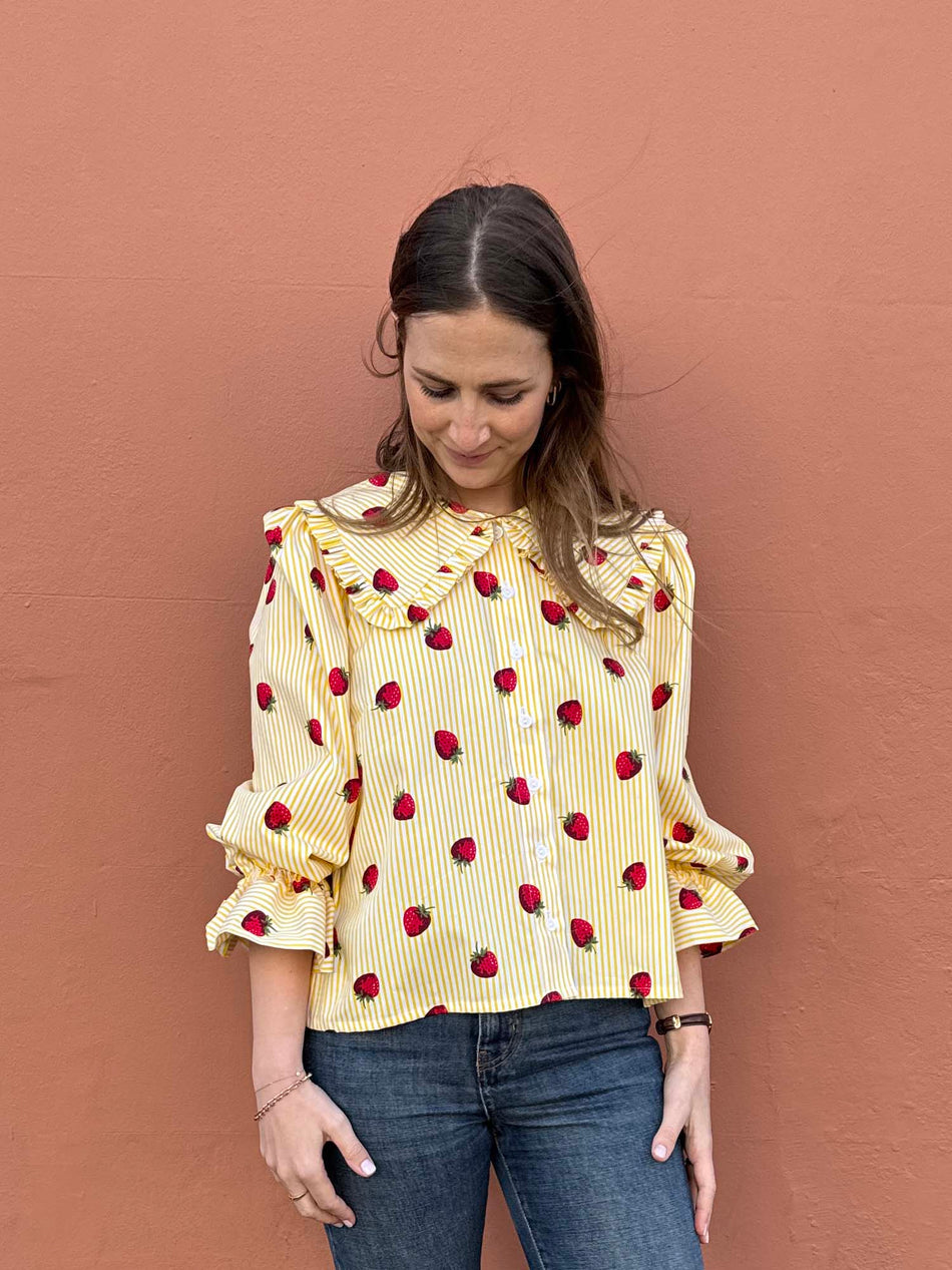 This Strawberry Print Cotton Luna Blouse is made from 100% breathable cotton and perfect for feeling comfortable, charming, and joyful every day. It has a lovely frill neckline, gathered sleeves, and a cheerful yellow stripe covered in hand-drawn strawberries, making it a must-have for effortless spring and summer style.