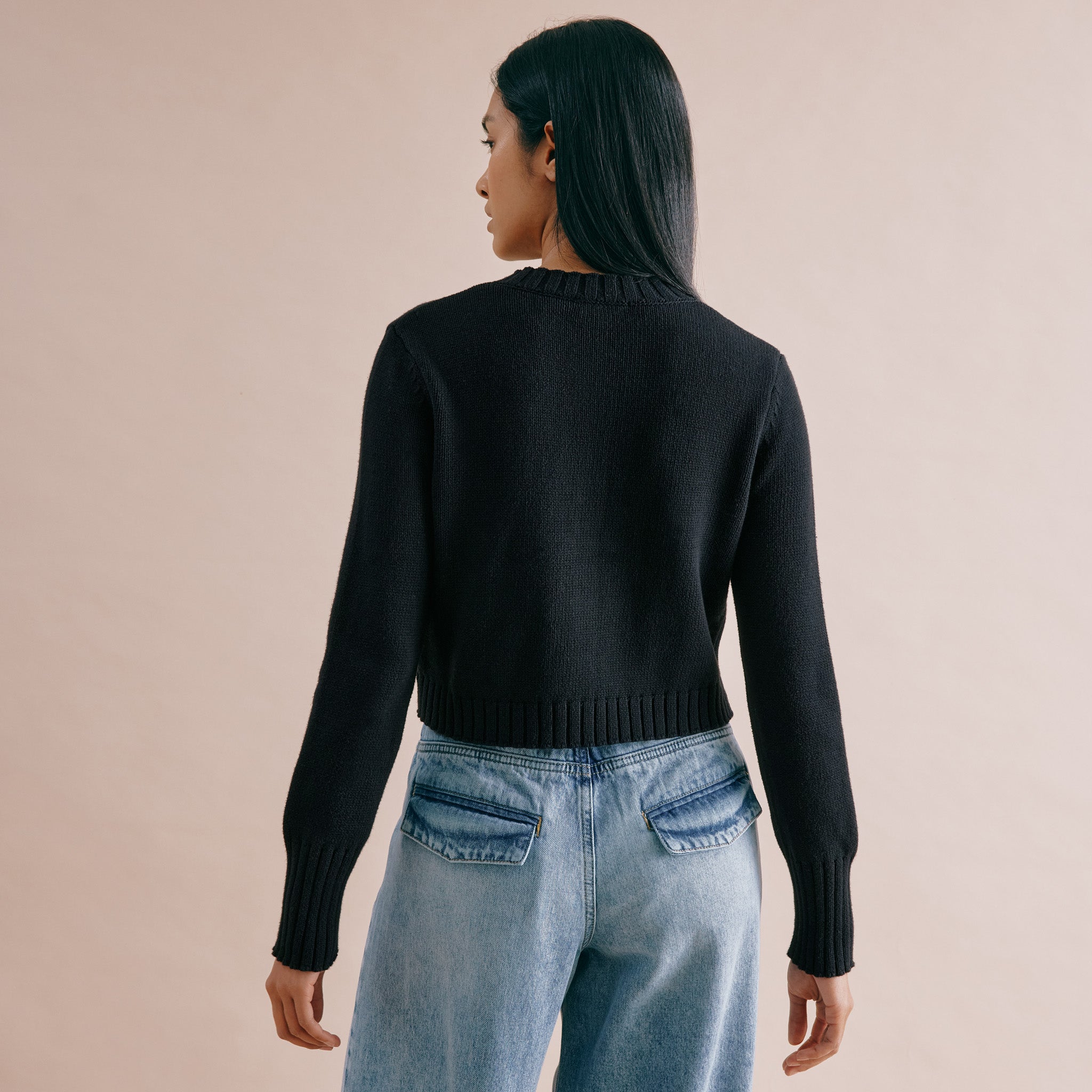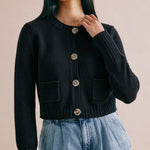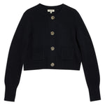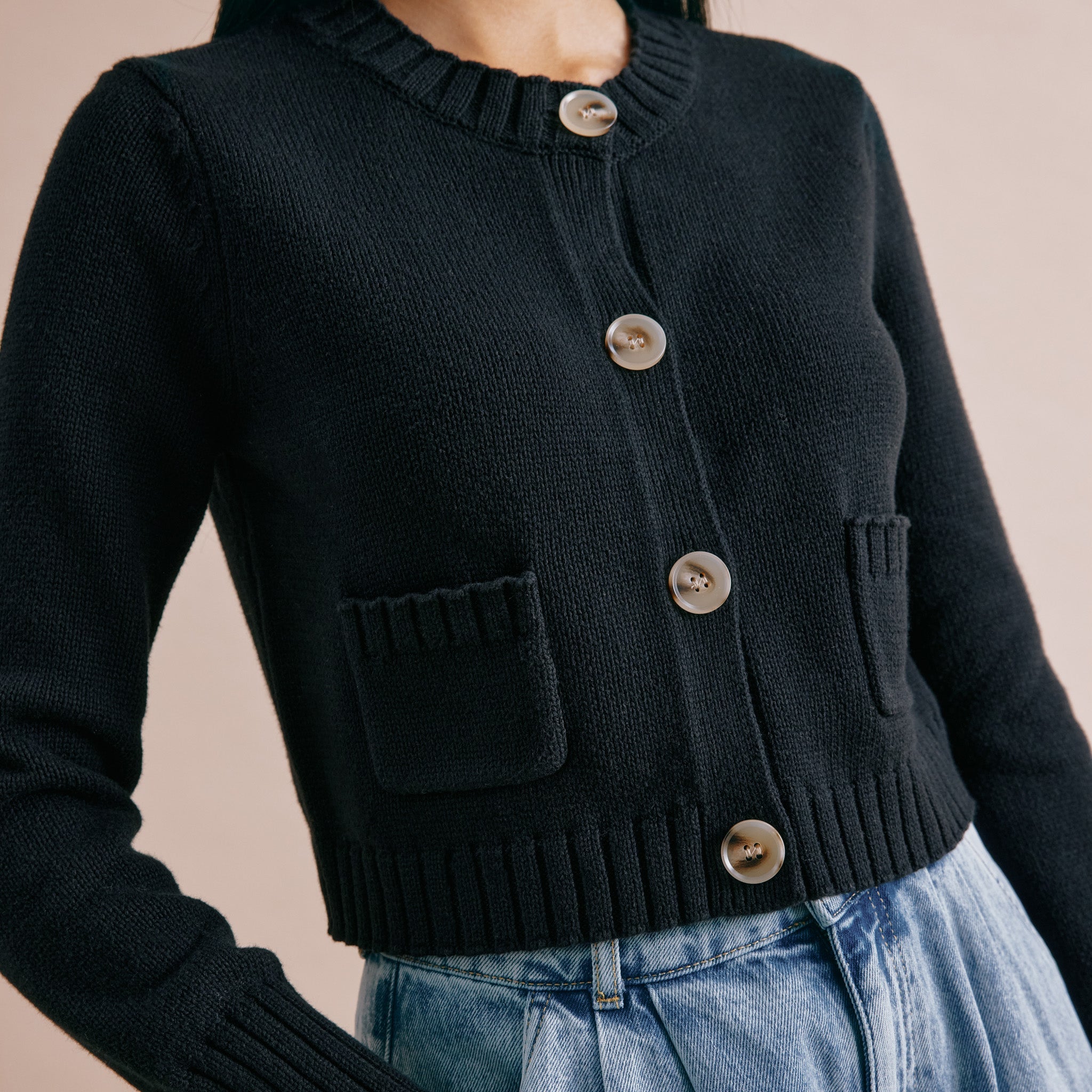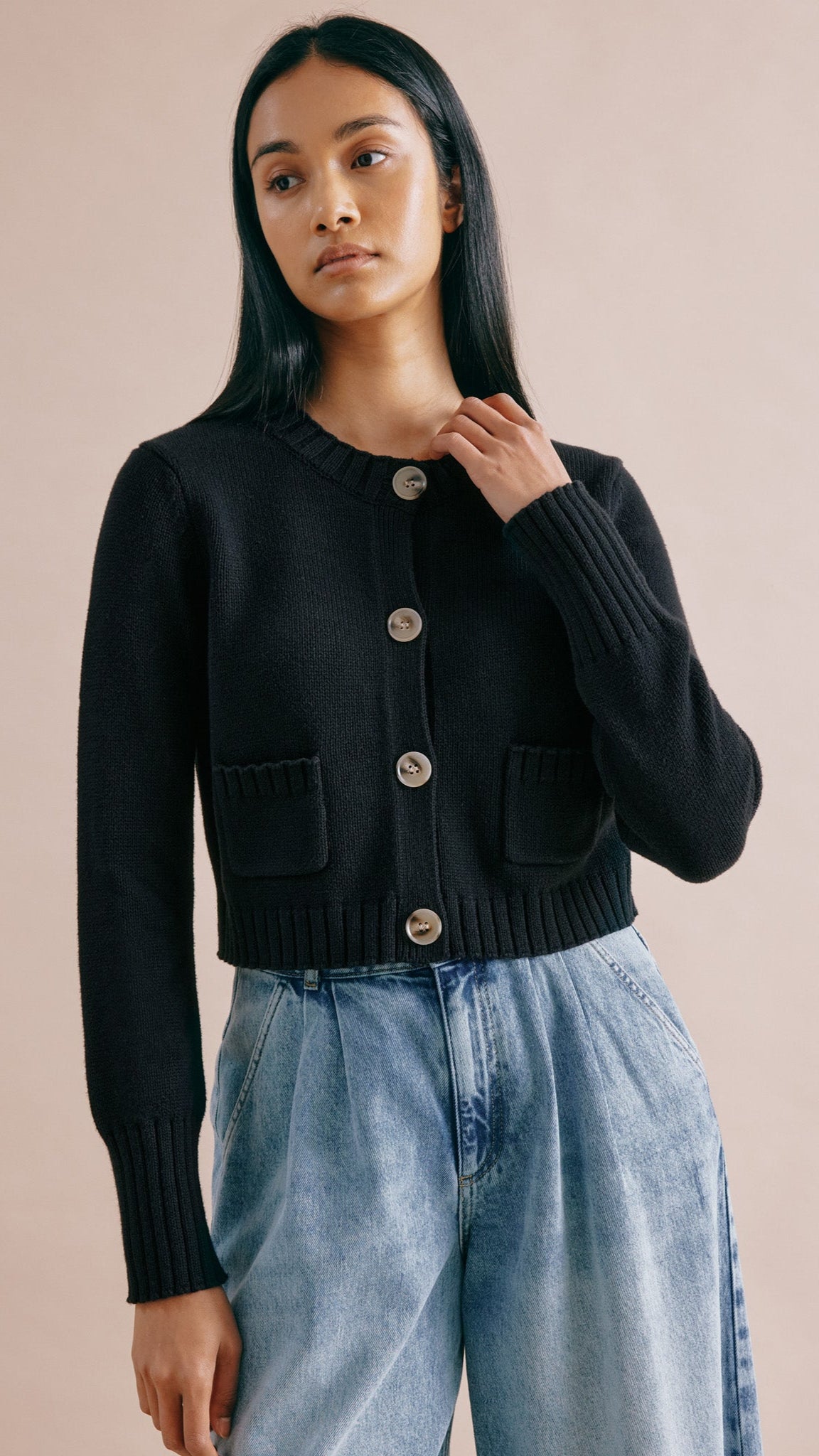 This black cotton cardigan has a soft knit and a cropped silhouette, making it both fashionable and comfortable. It comes with convenient patch pockets and four horn-effect buttons, making it a great layering piece.