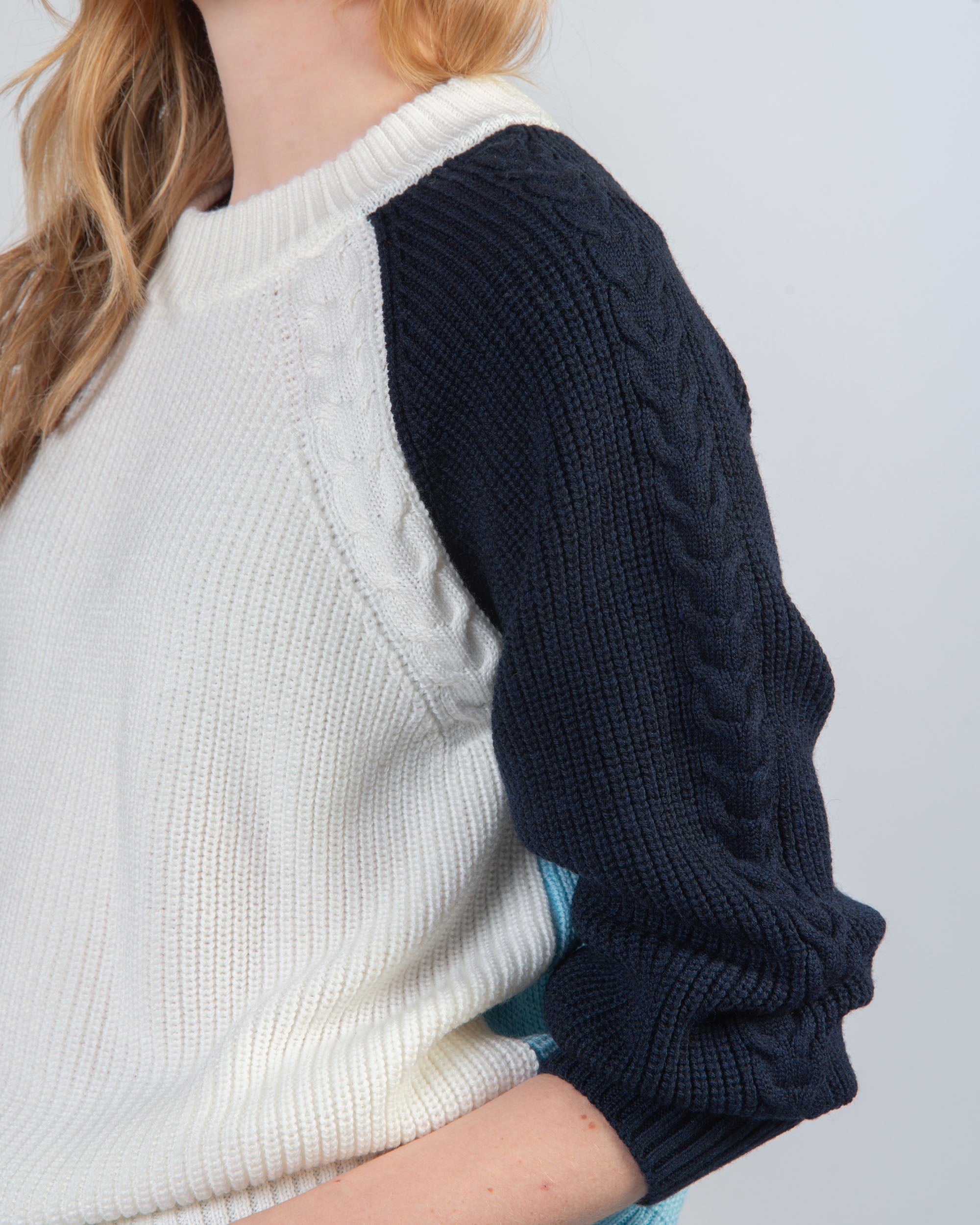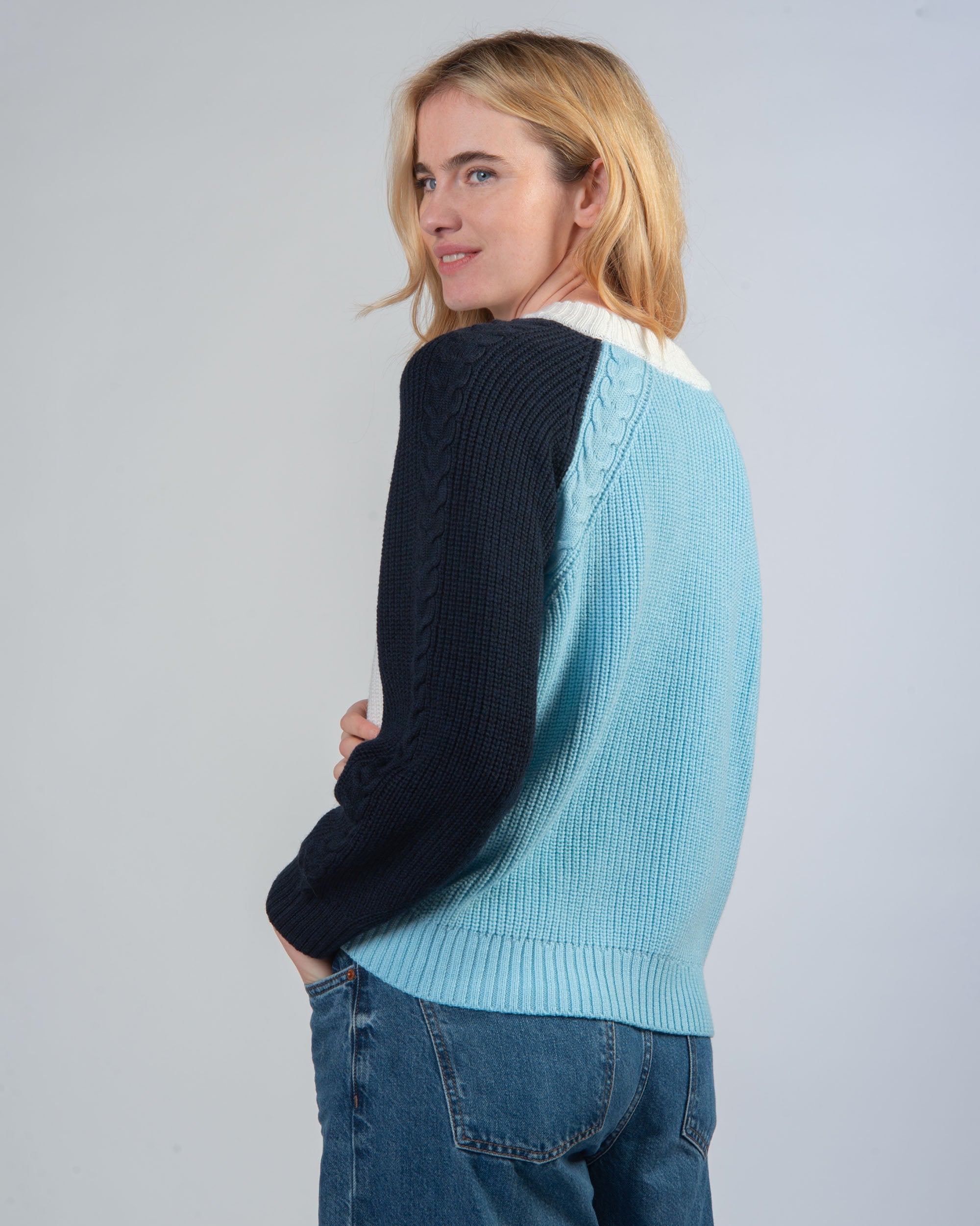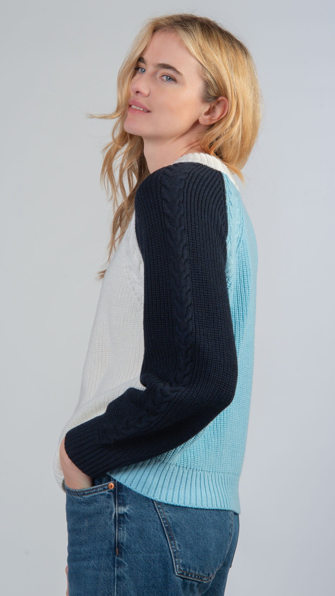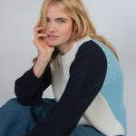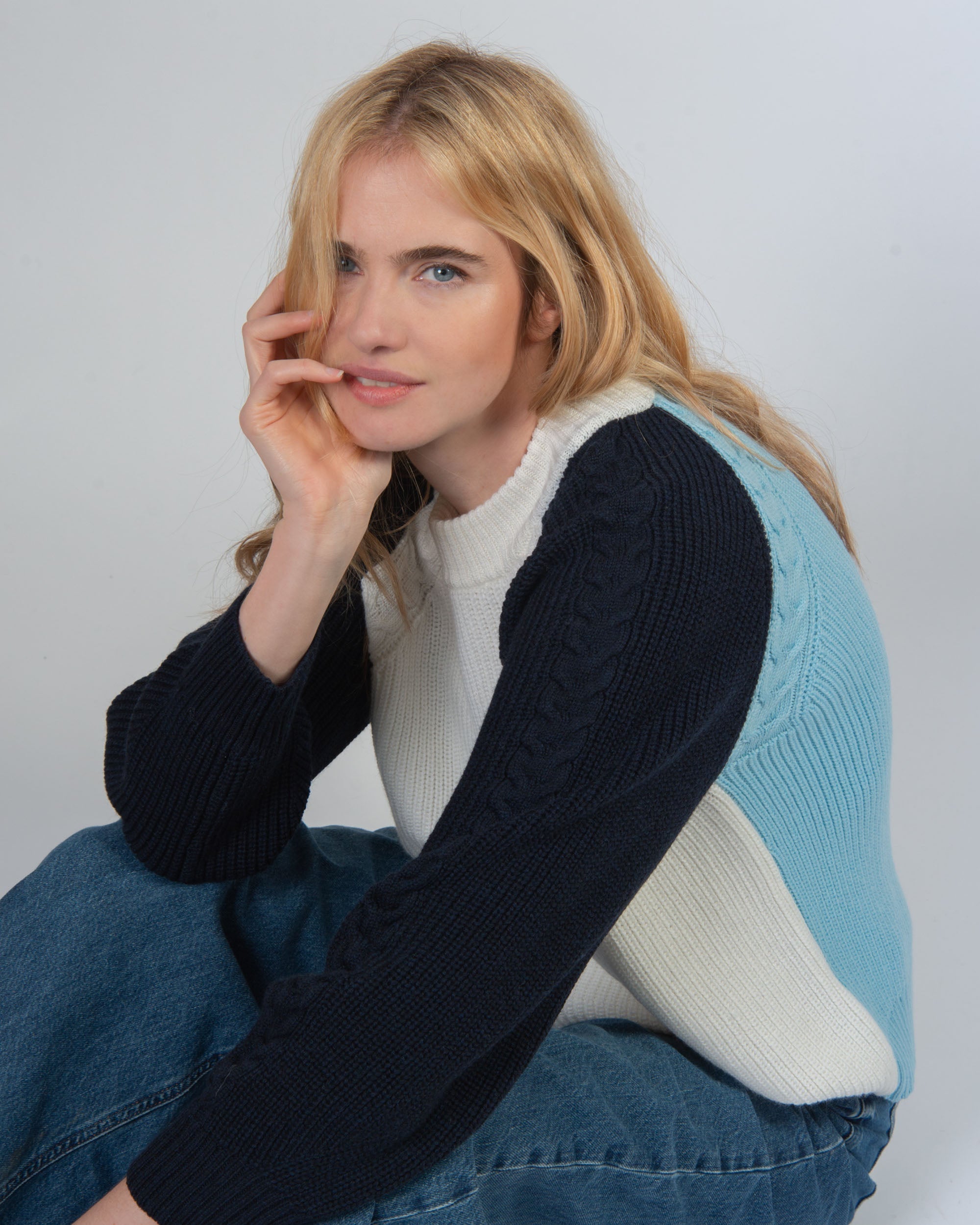 Stay cozy and comfortable with this Italian merino wool crew neck sweater, designed with temperature-regulating properties. Feminine cable detailing on the sleeves adds a modern touch to this classic Fisherman's style, with a contemporary colour-blocked finish.