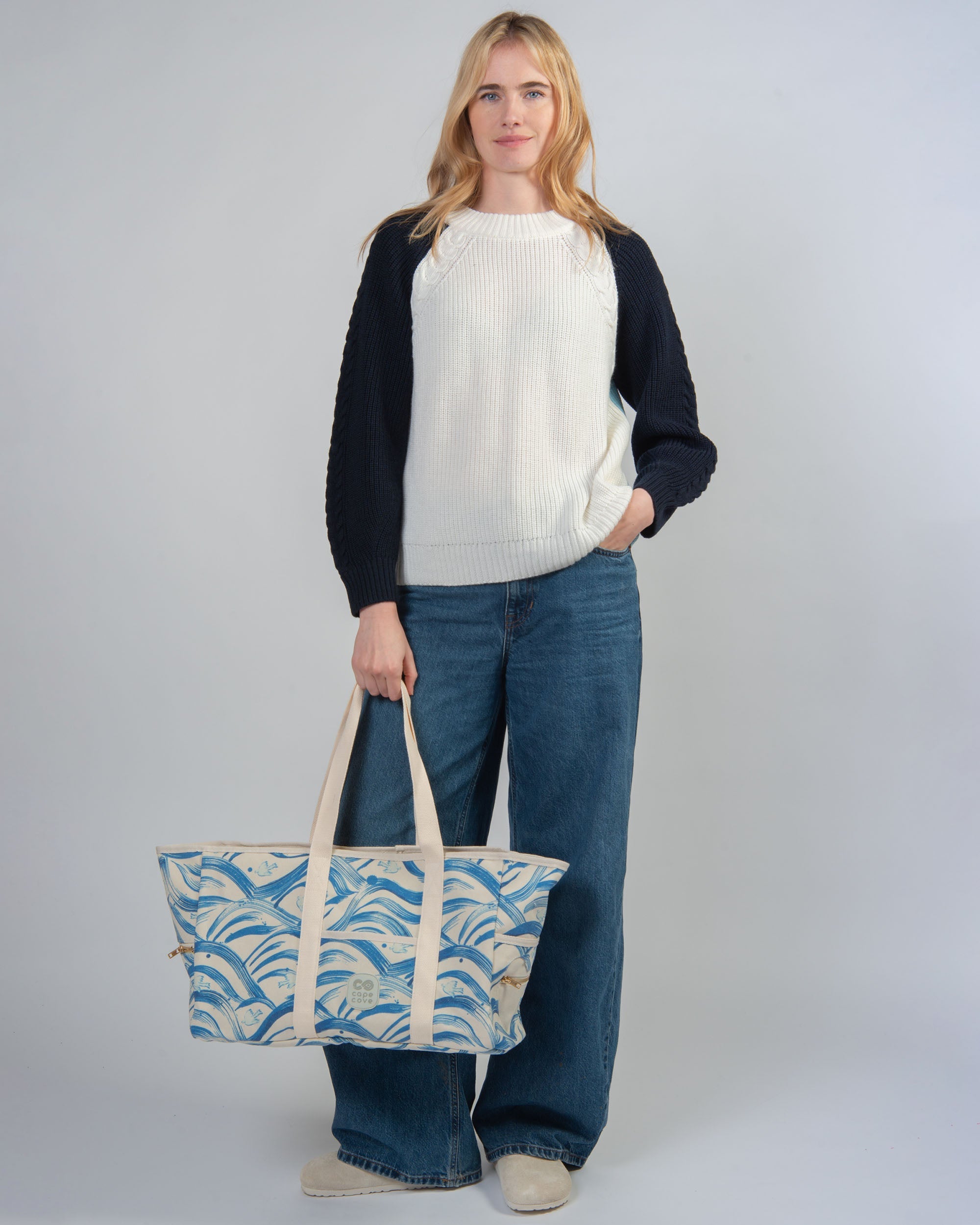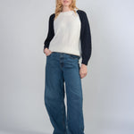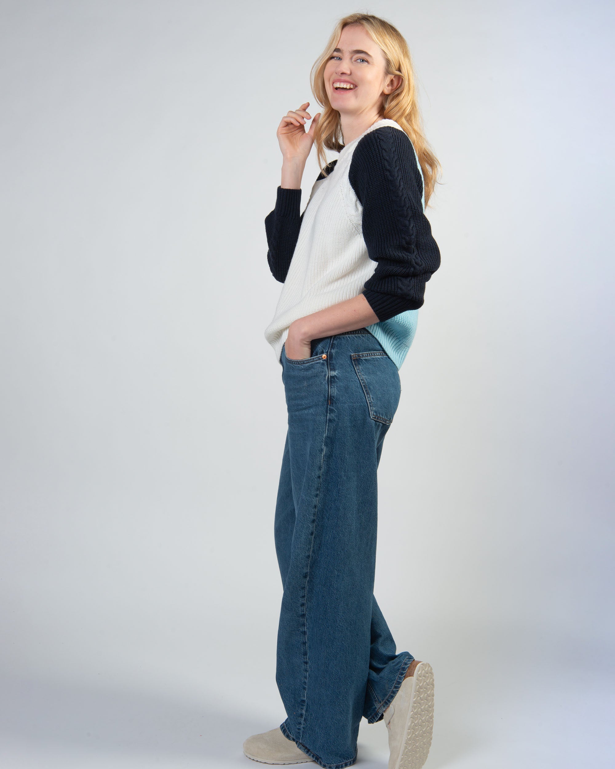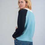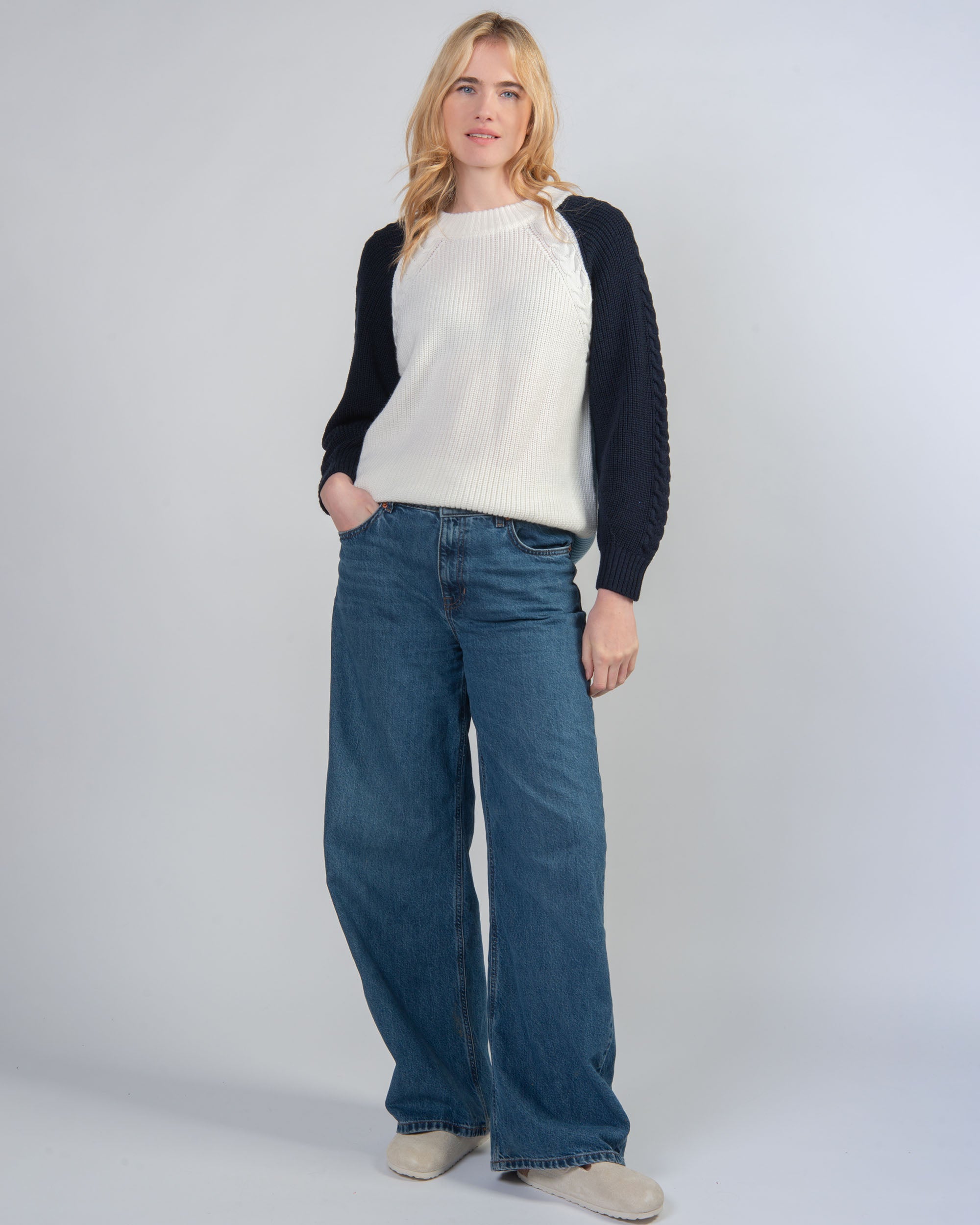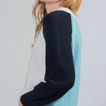 Stay cozy and comfortable with this Italian merino wool crew neck sweater, designed with temperature-regulating properties. Feminine cable detailing on the sleeves adds a modern touch to this classic Fisherman's style, with a contemporary colour-blocked finish.