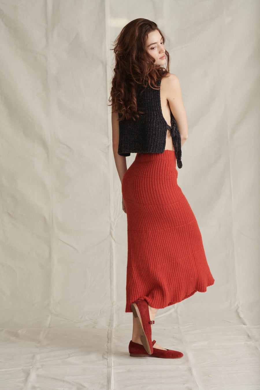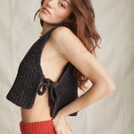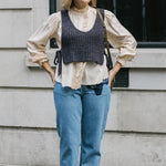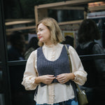 This deep indigo knit vest works beautifully as a transitional piece, layering easily over blouses, dresses or t-shirts while adding warmth and shape.