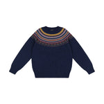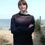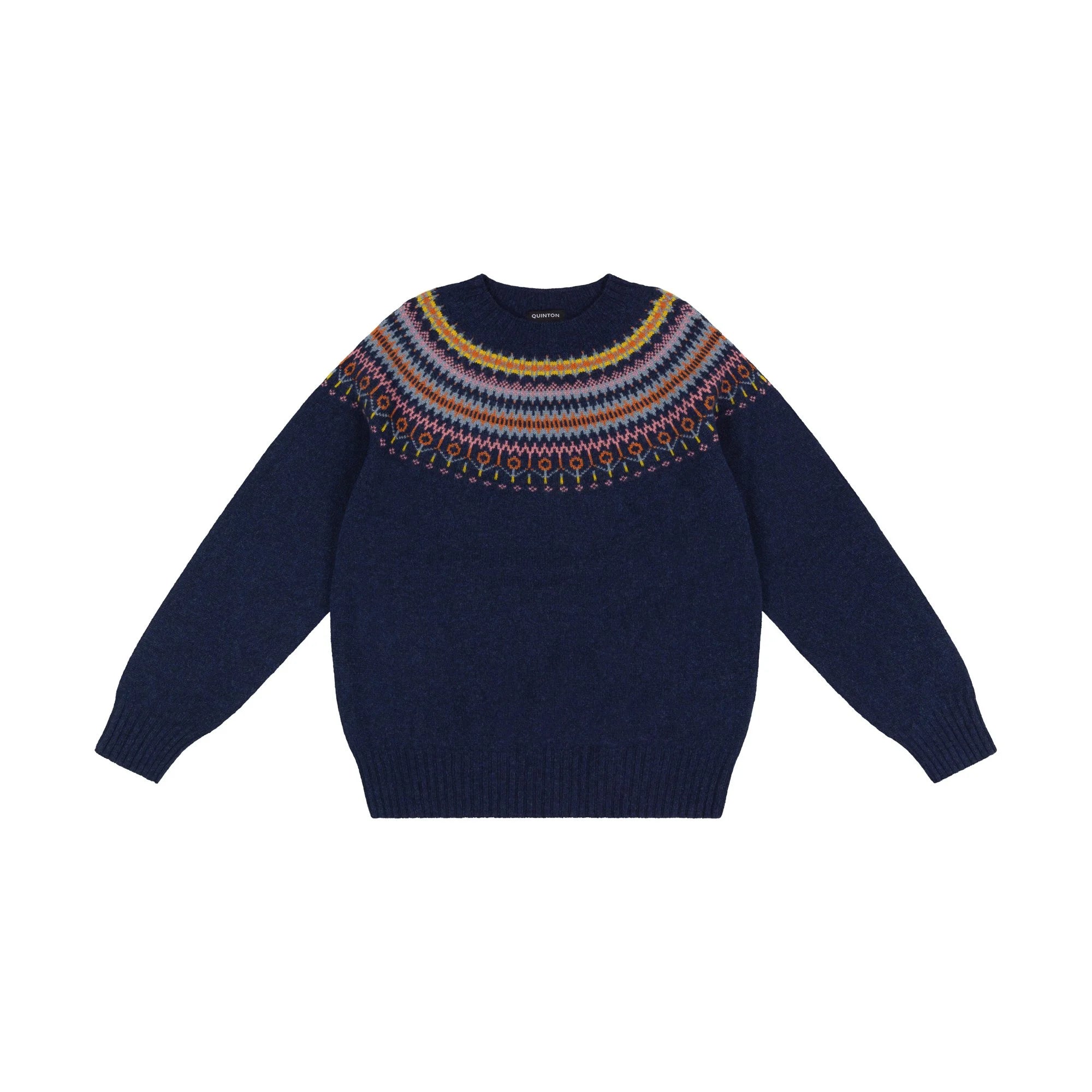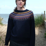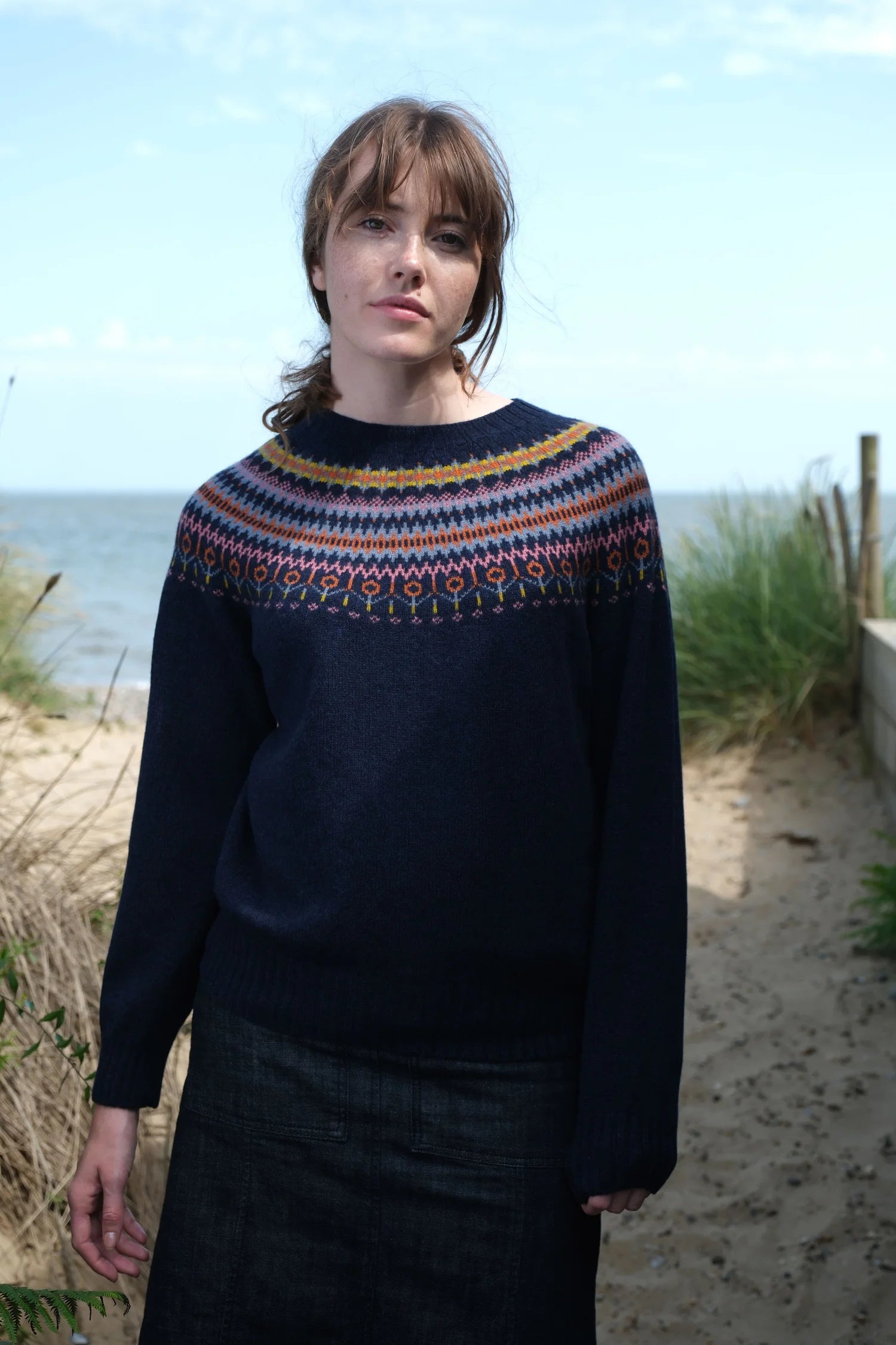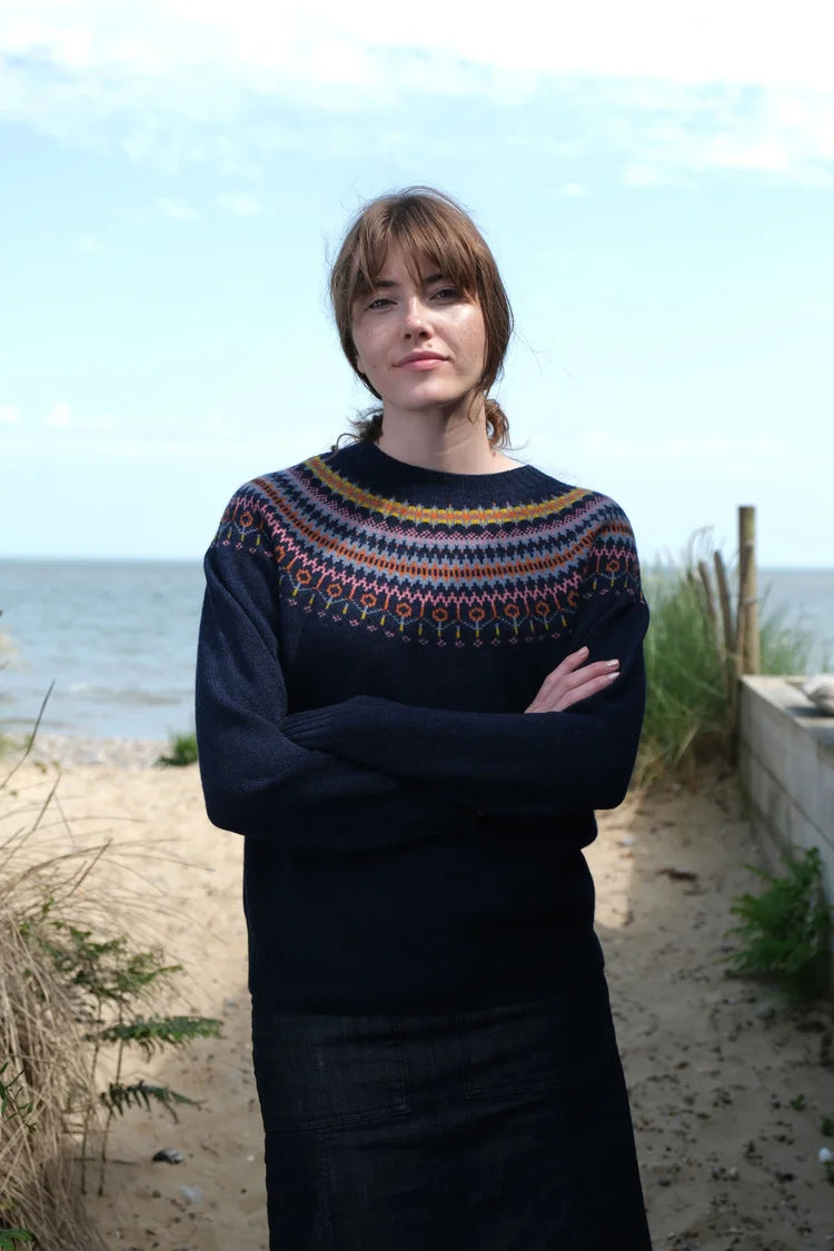 Inspired by night skies and meadow tones, the deep navy base contrasts with pops of pink and mustard across the yoke, creating a striking seasonal knit.