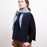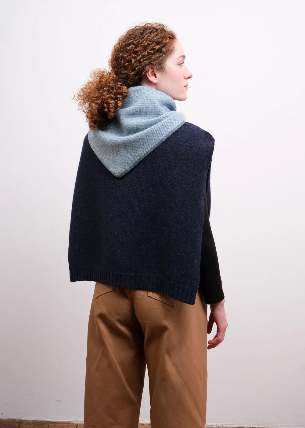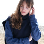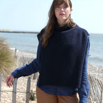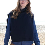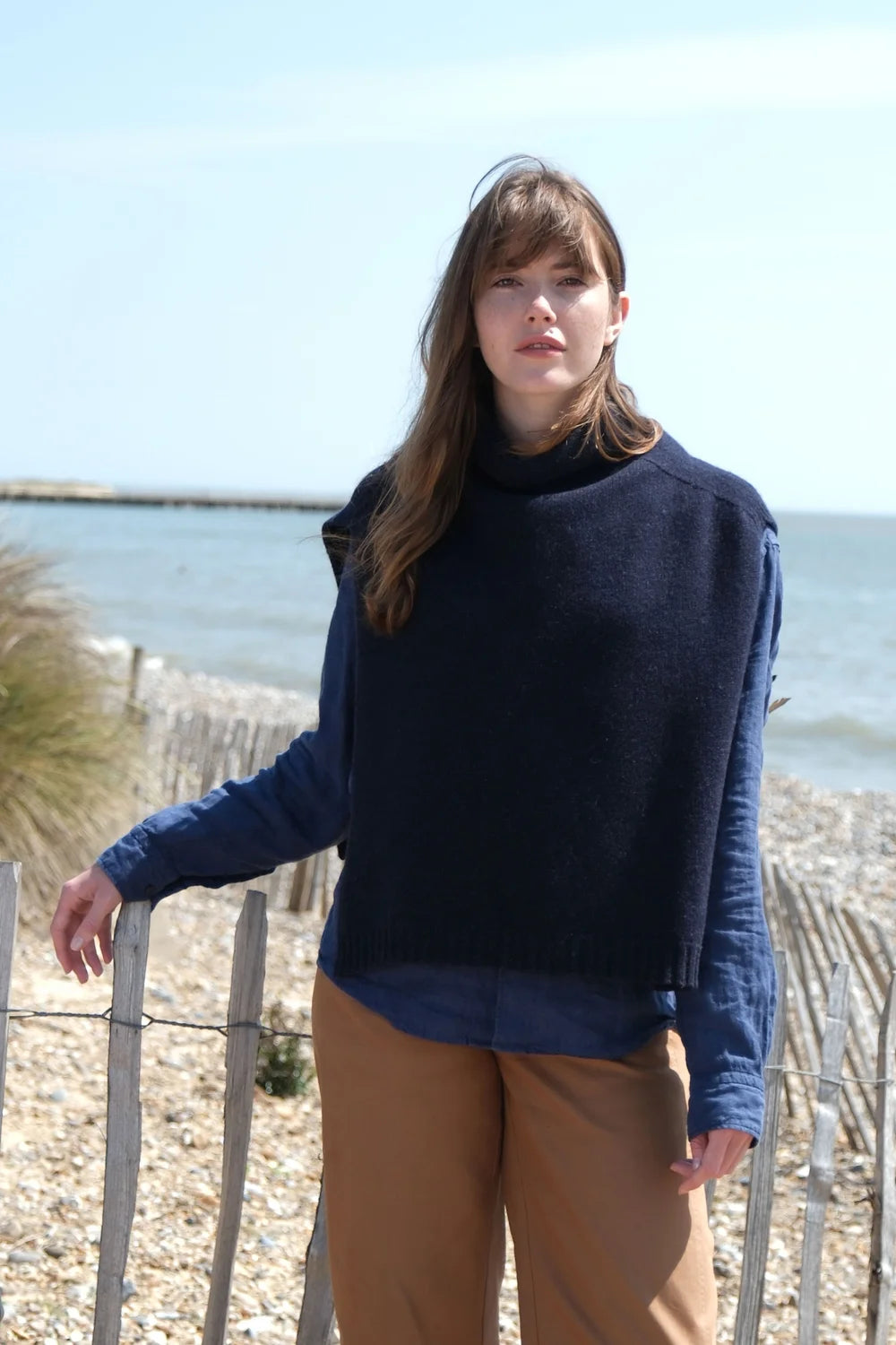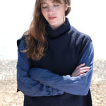The Funnel Neck Tabard by Quinton + Chadwick is a versatile navy knit vest crafted from 100% lambswool. Soft, warm, and easy to style, it adds interest to the simplest of outfits while keeping you cosy through cooler days.