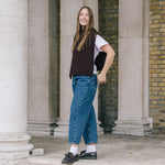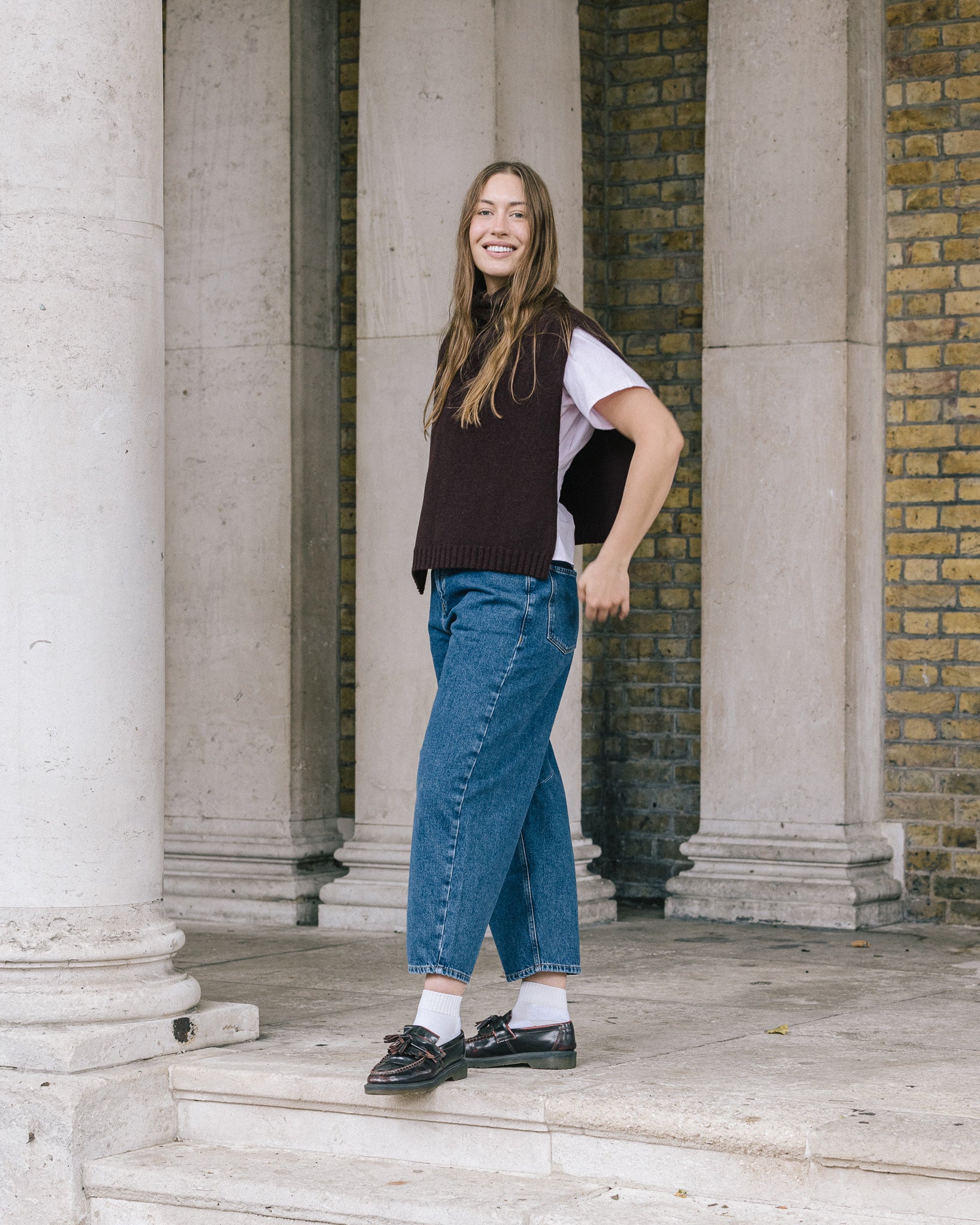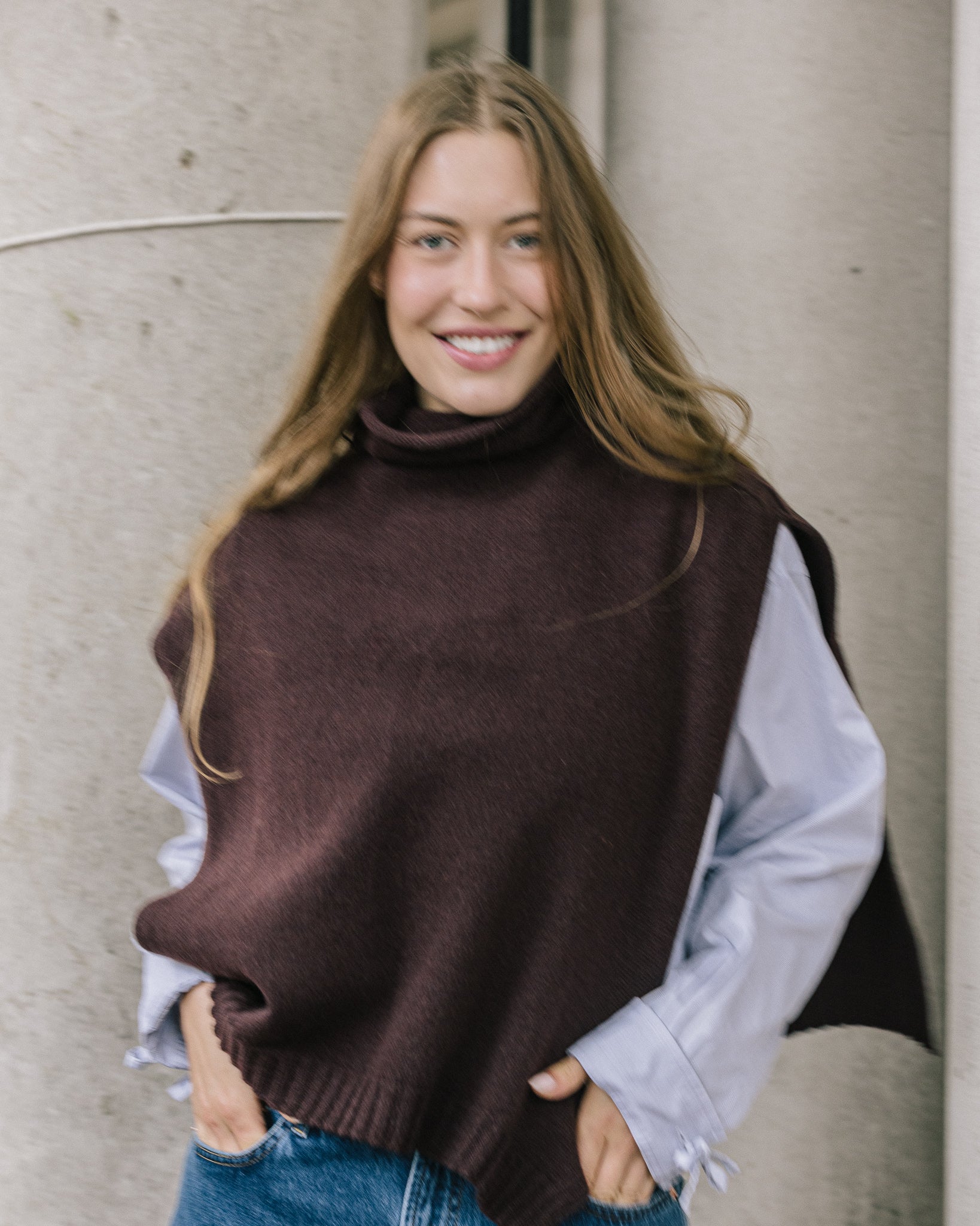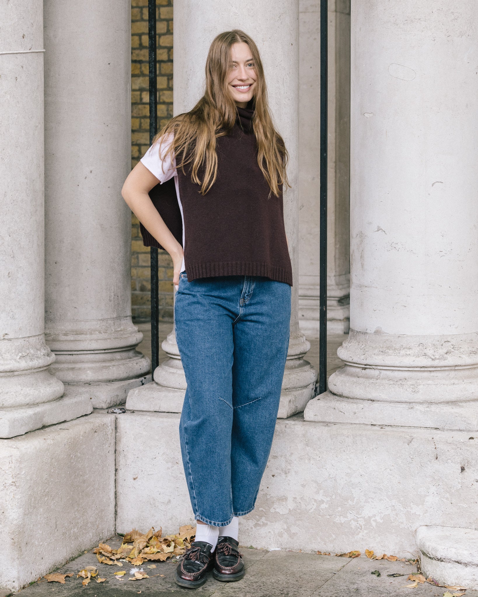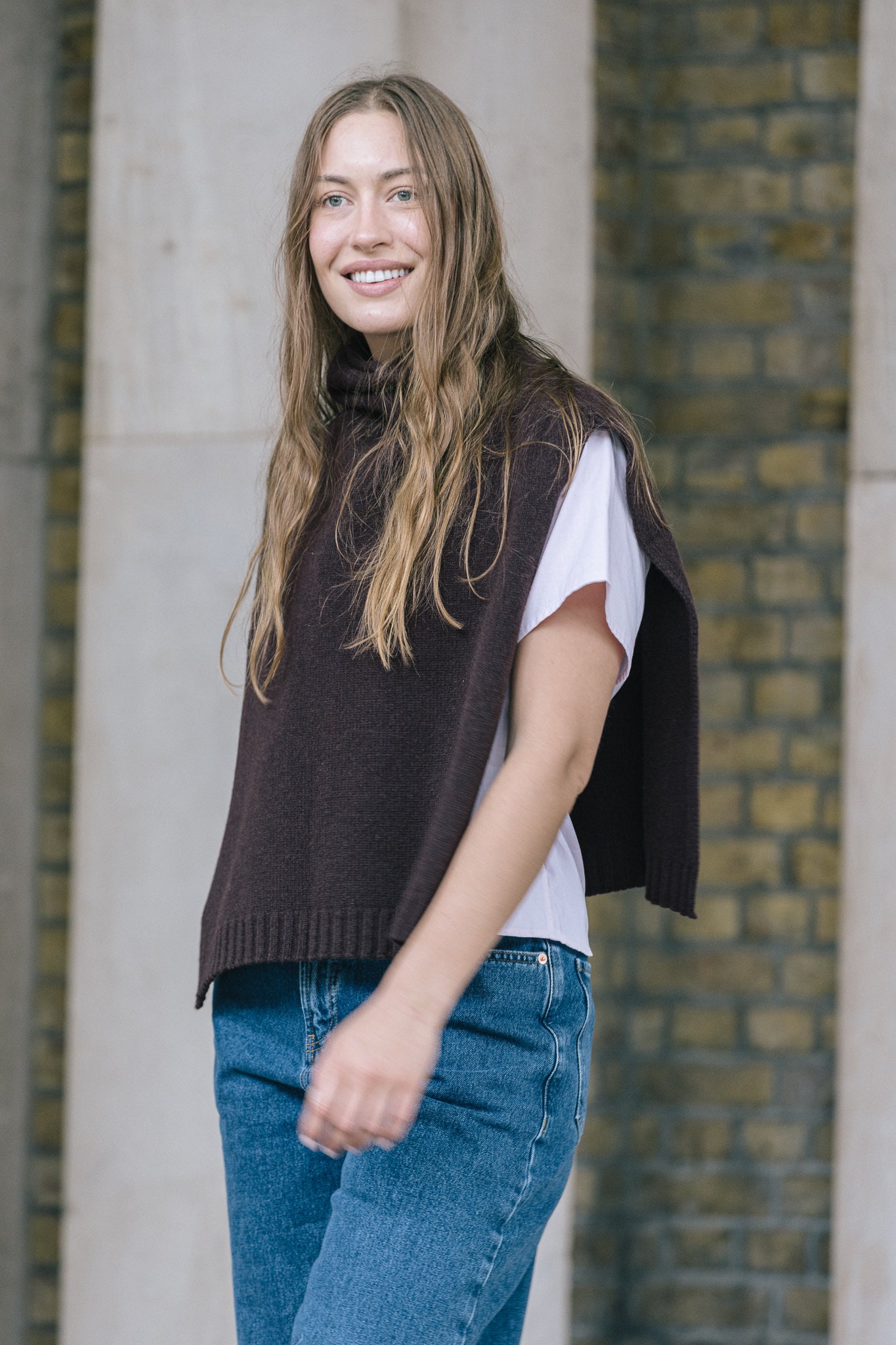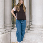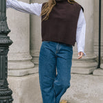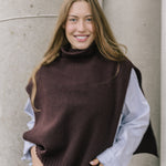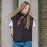 The Funnel Neck Tabard in a deep chocolate coloured burgundy by Quinton + Chadwick, crafted from 100% lambswool. In a rich autumnal shade, this versatile knit vest adds warmth, texture, and effortless style to autumn and winter looks.