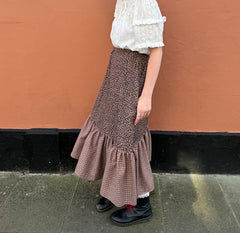Made from deadstock woven checked fabric which has been printed with a leopard motif. Lined with deadstock cotton fabric. Deep V with denim fabric tie at back. Mock jetted pockets on the front and finished with vintage buttons.