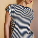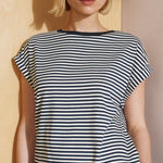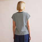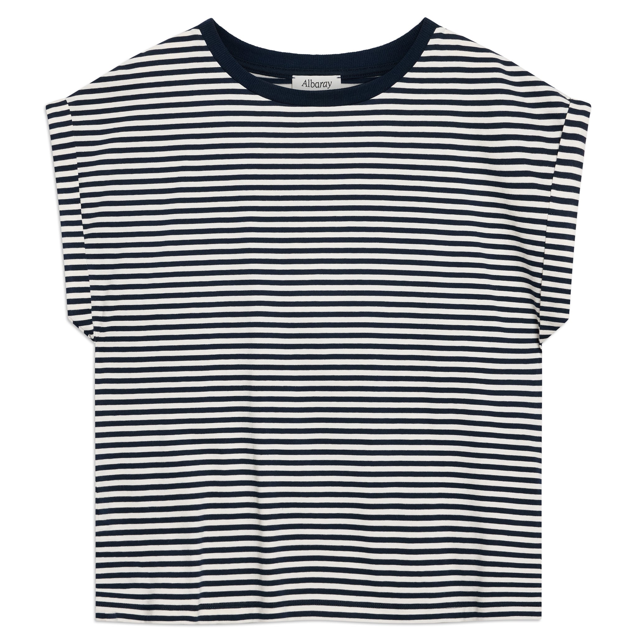The Navy Stripe Roll Back T-Shirt by Albaray is a relaxed fit striped t-shirt made from eco-friendly Greek cotton. A timeless 100% cotton t-shirt designed for effortless everyday wear.