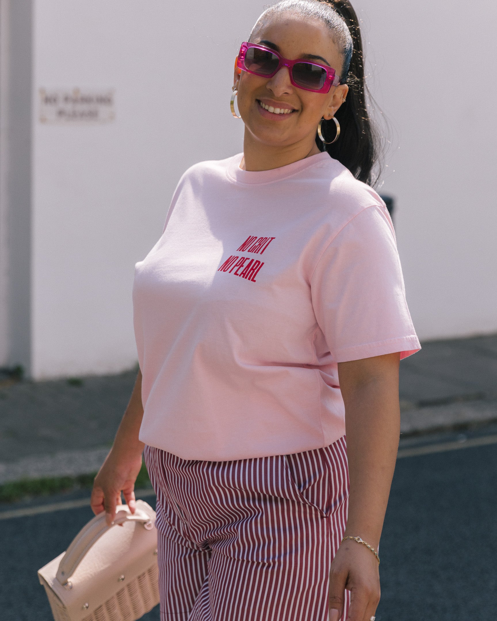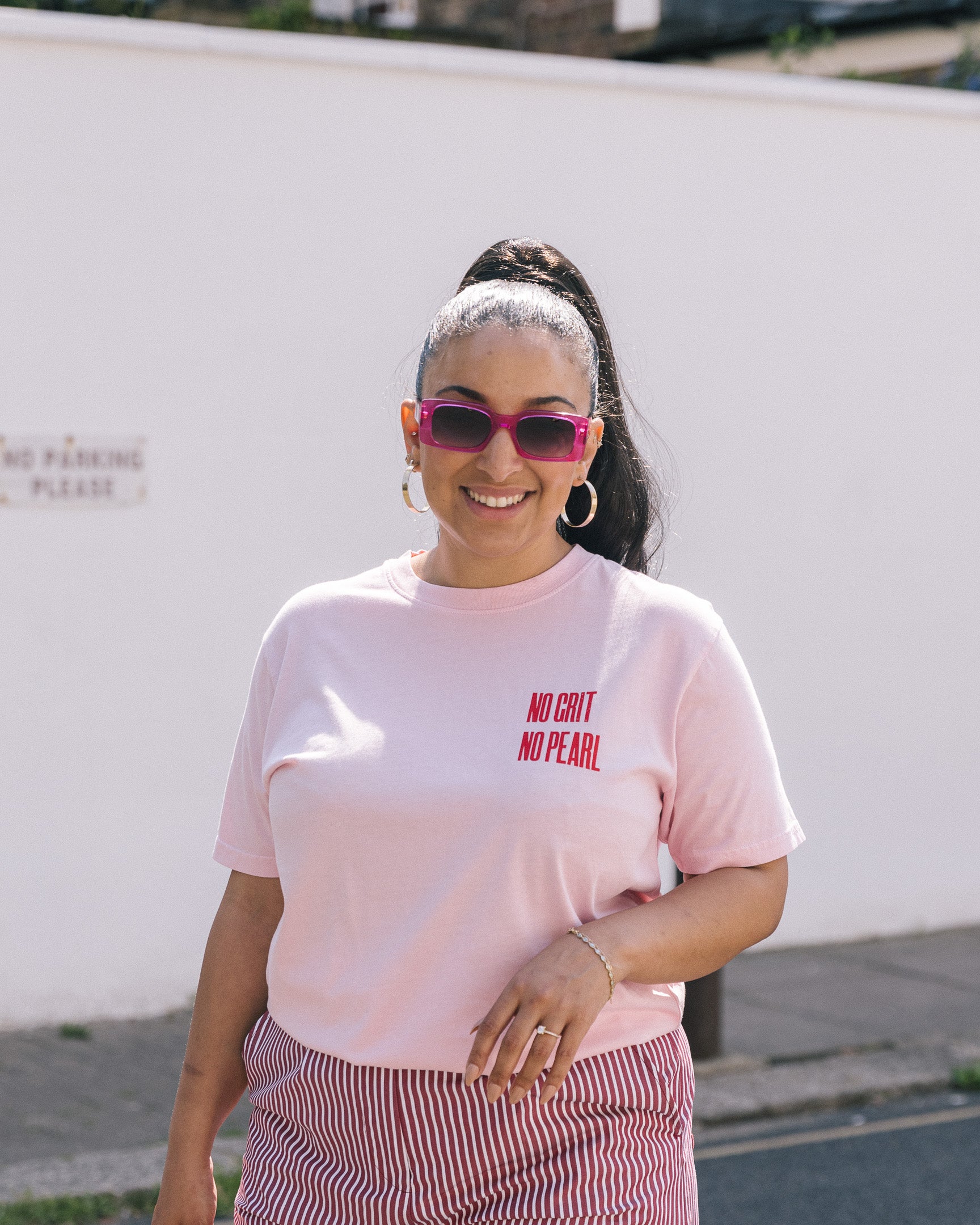 The "No Grit No Pearl" Organic Cotton T-Shirt by Black & Beech in pale pink with bold red detailing. A meaningful slogan tee designed to celebrate resilience.