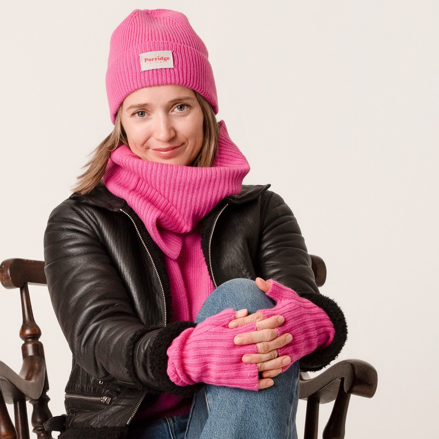 The Cashmere Wrist Warmers in Pink by Porridge Knitwear bring warmth and femininity to your winter look. Crafted from a luxurious wool-cashmere blend in peonie pink, they're soft, stylish and endlessly wearable.
