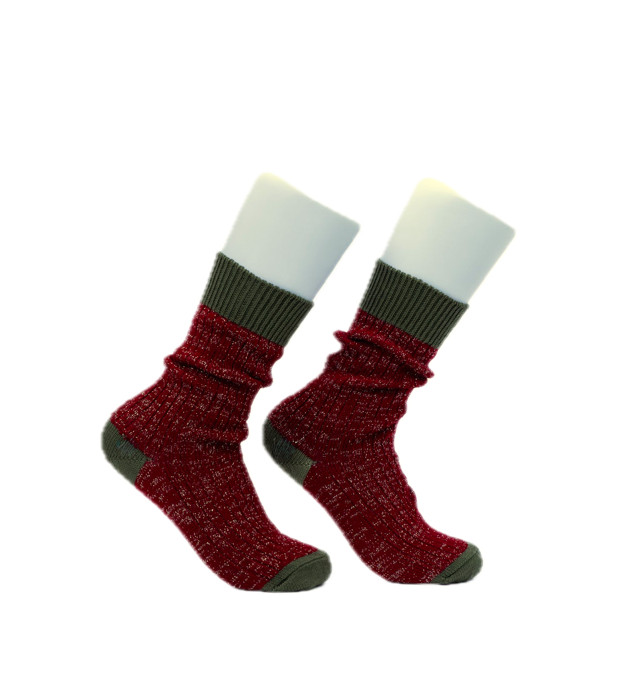 The Elsie Merino Wool Sock in Avocado & Burgundy by Elsie & Marj is a luxurious womens wool sock crafted from soft merino wool and finished with a sophisticated contrast toe and heel, plus a subtle shimmer of lurex.