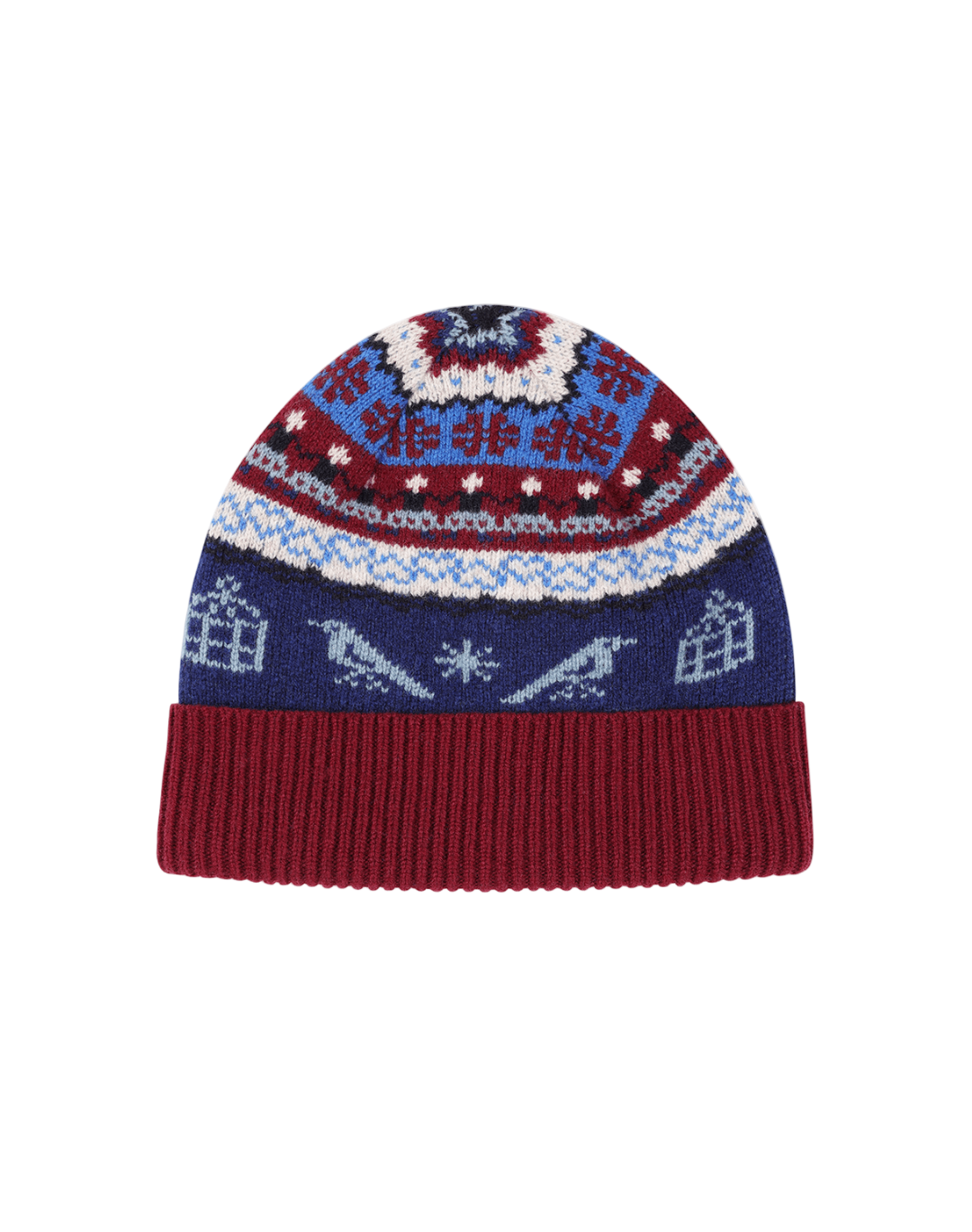 Featuring a contemporary take on the Fairisle pattern, this beanie combines cobalt blue and claret tones for a statement winter look. The double jacquard knit gives depth, warmth, and durability.