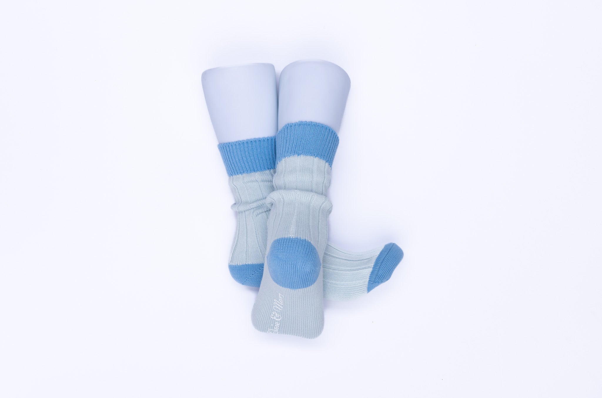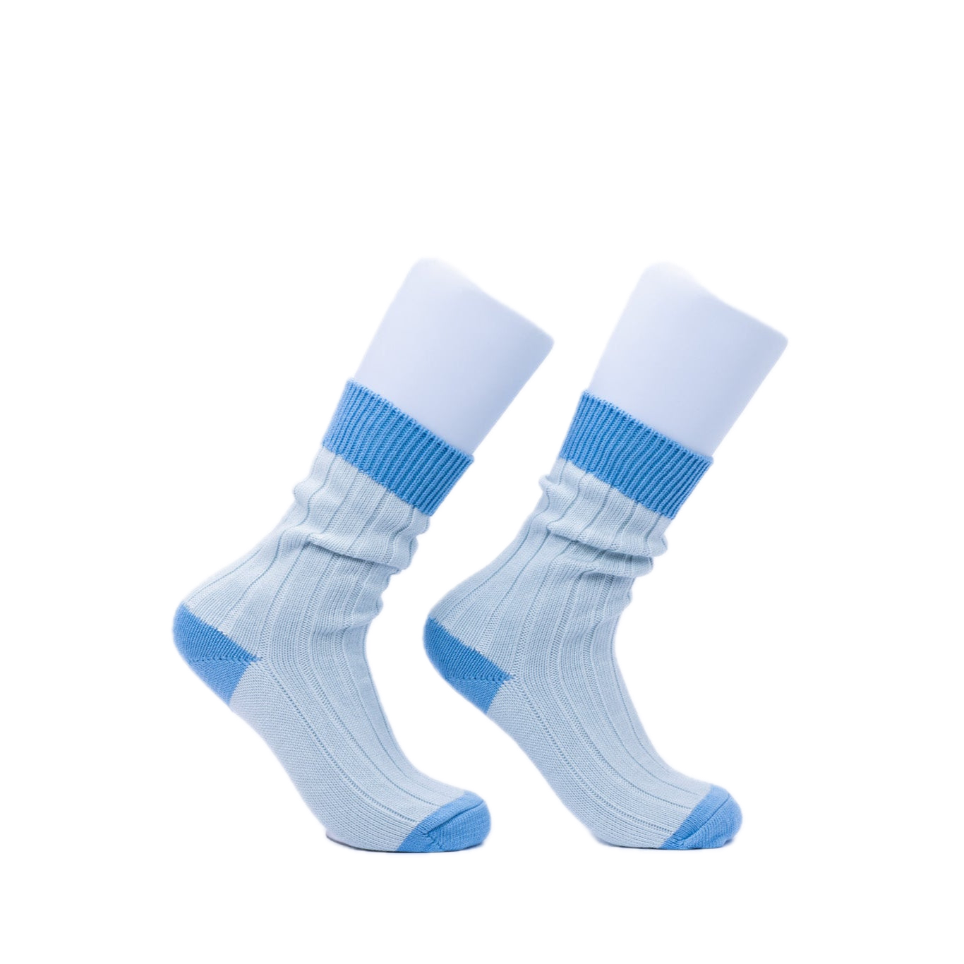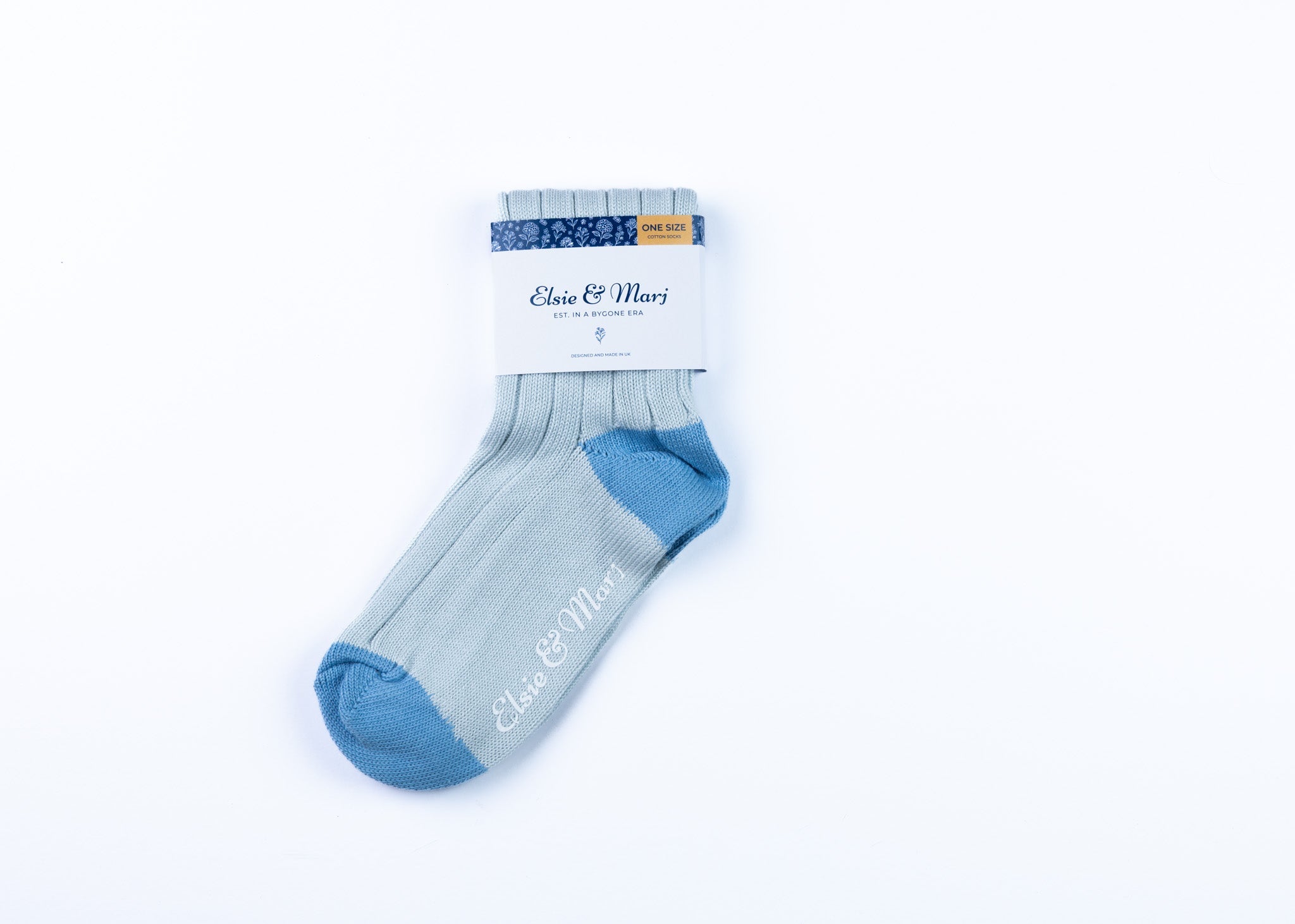 The Thelma Cotton Sock in China & Powder Blue by Elsie & Marj is a soft, breathable pair of womens socks with a fresh contrast toe and heel for easy everyday styling.