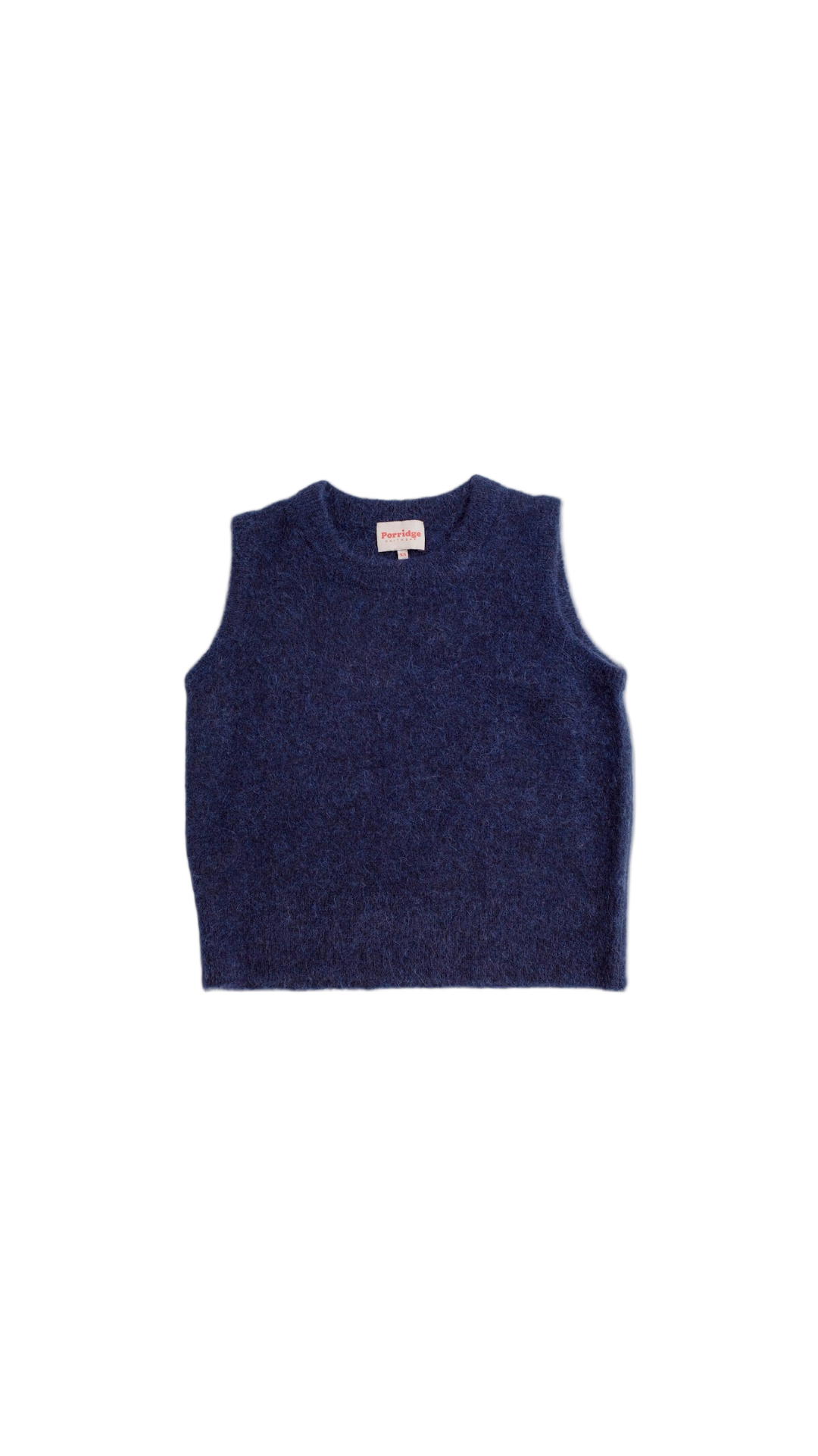 The Julia Alpaca Knitted Vest in Inky Blue by Porridge Knitwear is a beautifully soft, fluffy tank crafted from a luxurious alpaca wool blend. Designed with a cropped fit, it's the perfect layering piece to wear alone, over shirts, or styled with the matching Gerry Cardigan.