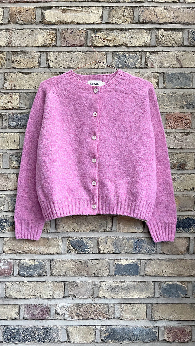 Meet the Ada Cardigan by Elwin, a cozy crewneck cardigan made from 100% British spun lambswool with a brushed finish. Knitted by hand in Scotland, this sweater boasts a relaxed, slightly cropped fit, falling just at the hip. A soft and lightweight knit, perfect for year-round wear. Finished with corozo nut buttons and 100% cotton ribbon trims, ensuring your cardigan is fully biodegradable.