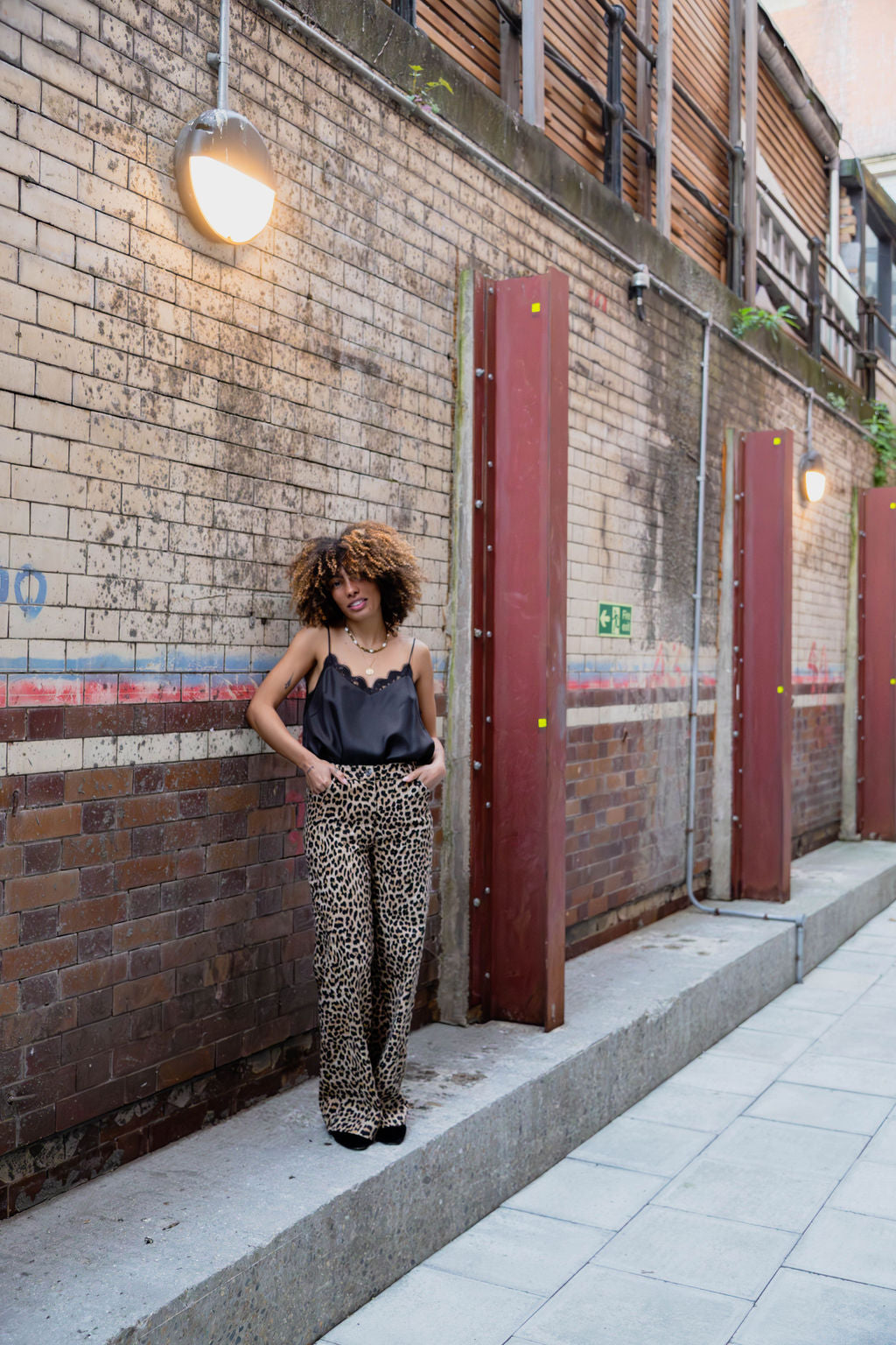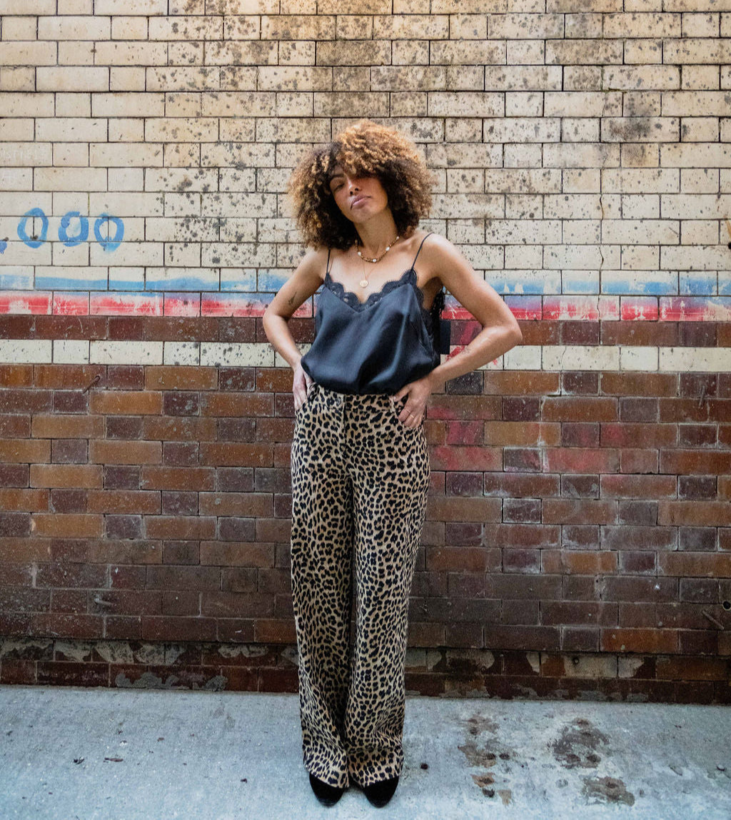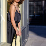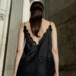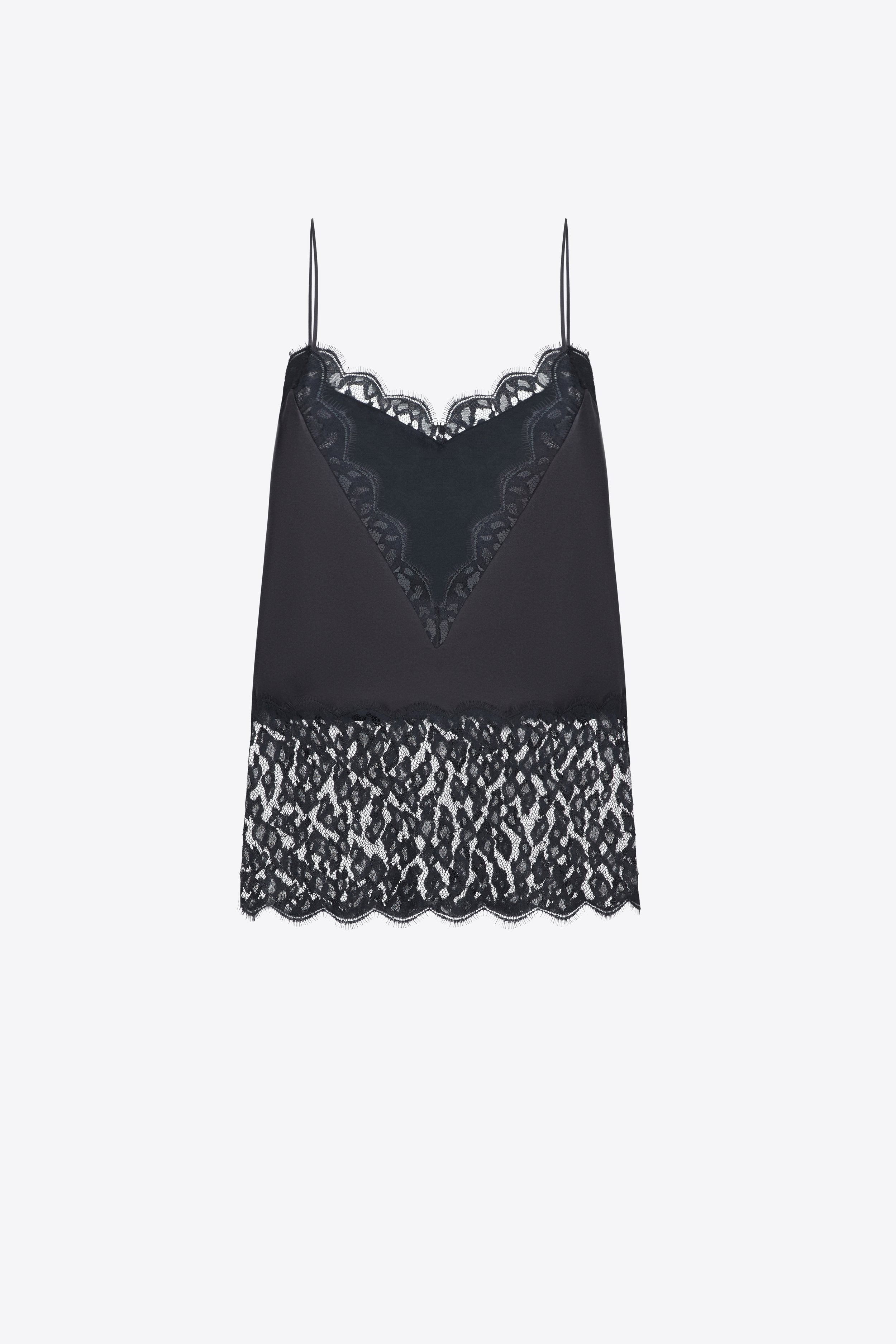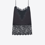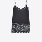 This black silk leopard lace trimmed cami is designed to fit any occasion: from brunch with friends to cocktails or simply paired with jeans.