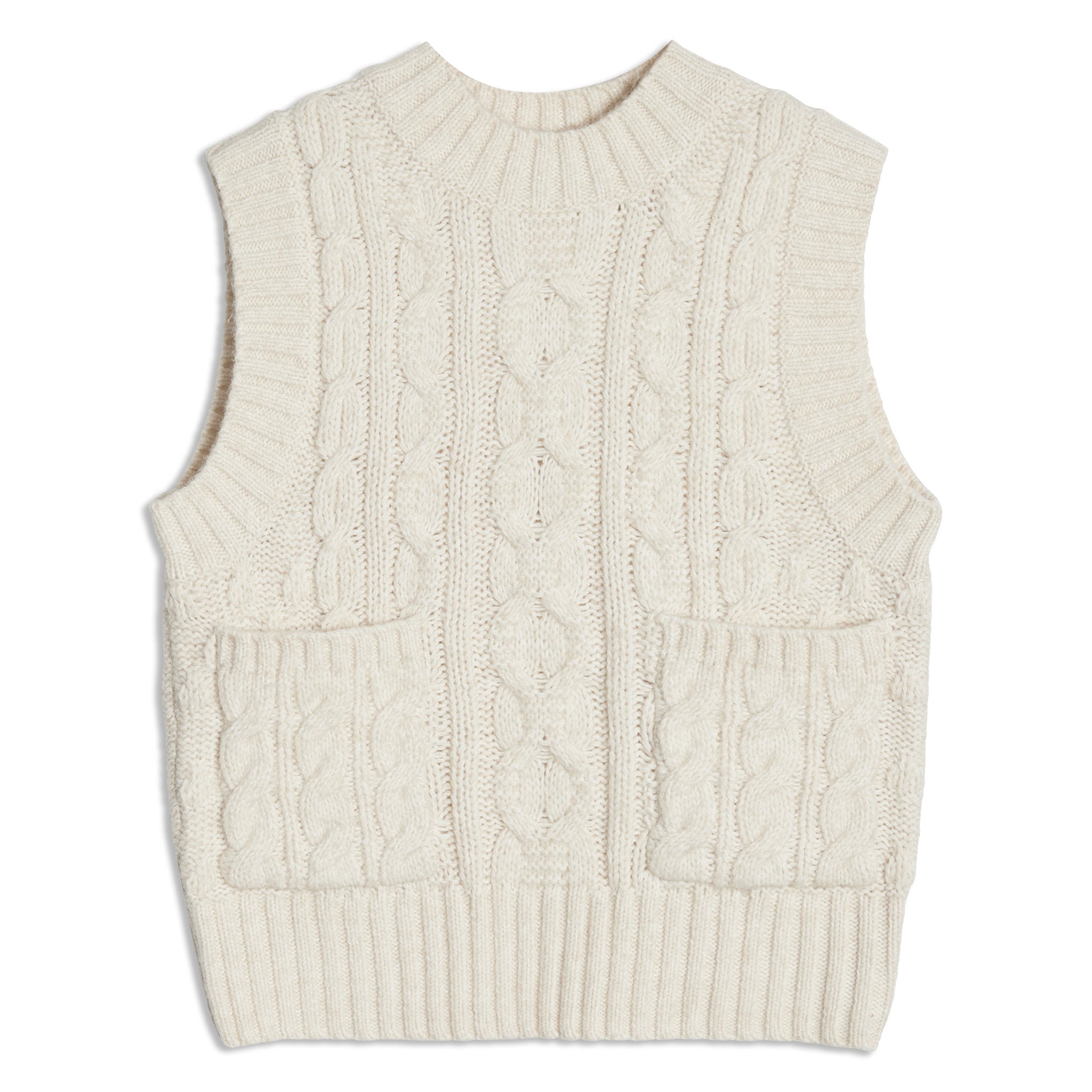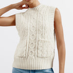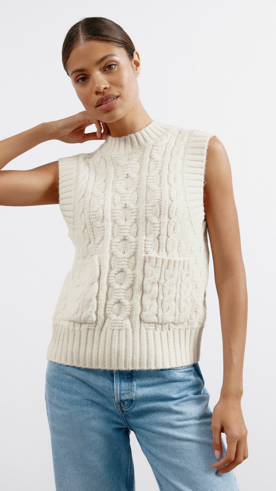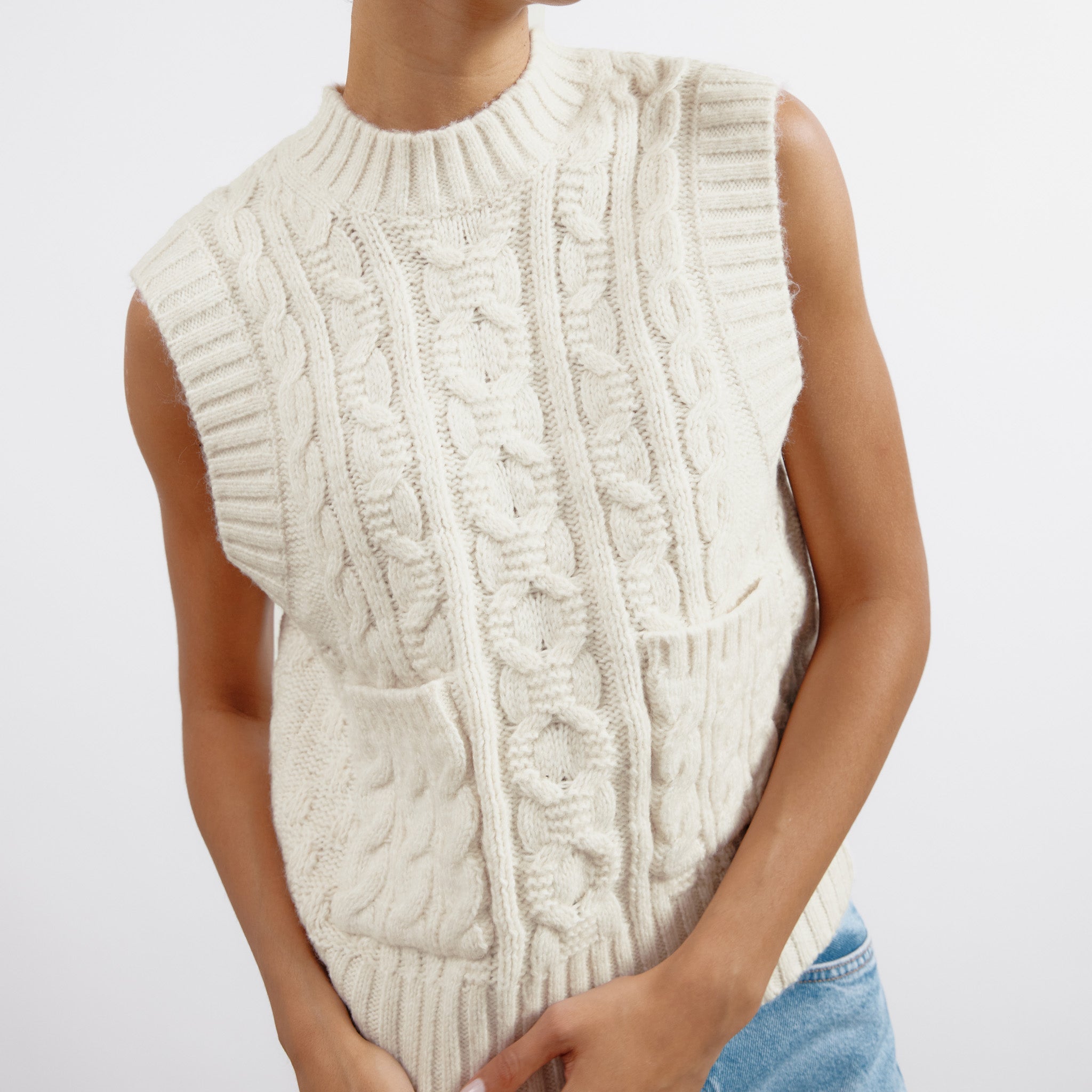 Stay cozy and stylish with the Cream Cable Pocket Tank by Albaray. This knitted tank boasts a classic cable pattern and ribbed trims, along with two patch pockets for added convenience.