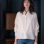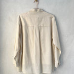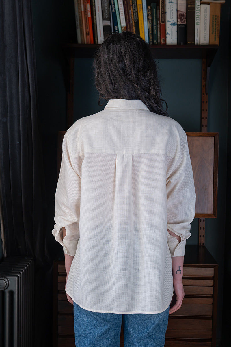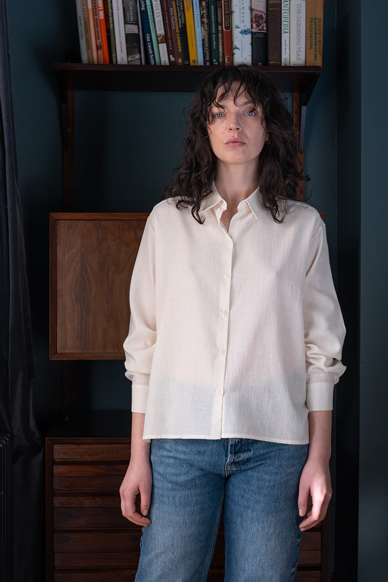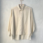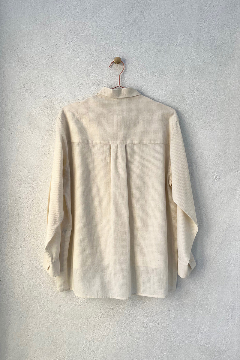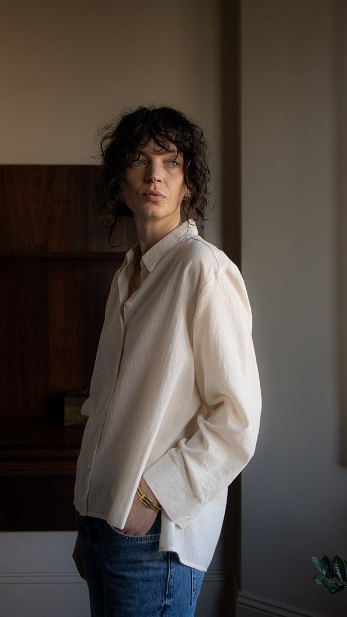 The Patti Ecru Shirt by Elwin captures the effortless and comfortable style of a men's shirt with its oversized fit, dropped shoulders, and relaxed design. Whether you choose to wear it tucked in or loose over a skirt or trousers, this versatile shirt with its boxy fit and straight hem is perfect for year-round wear. Layer it under a knitted vest or sweater during colder months or wear it solo when the weather is warm.