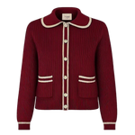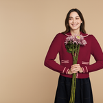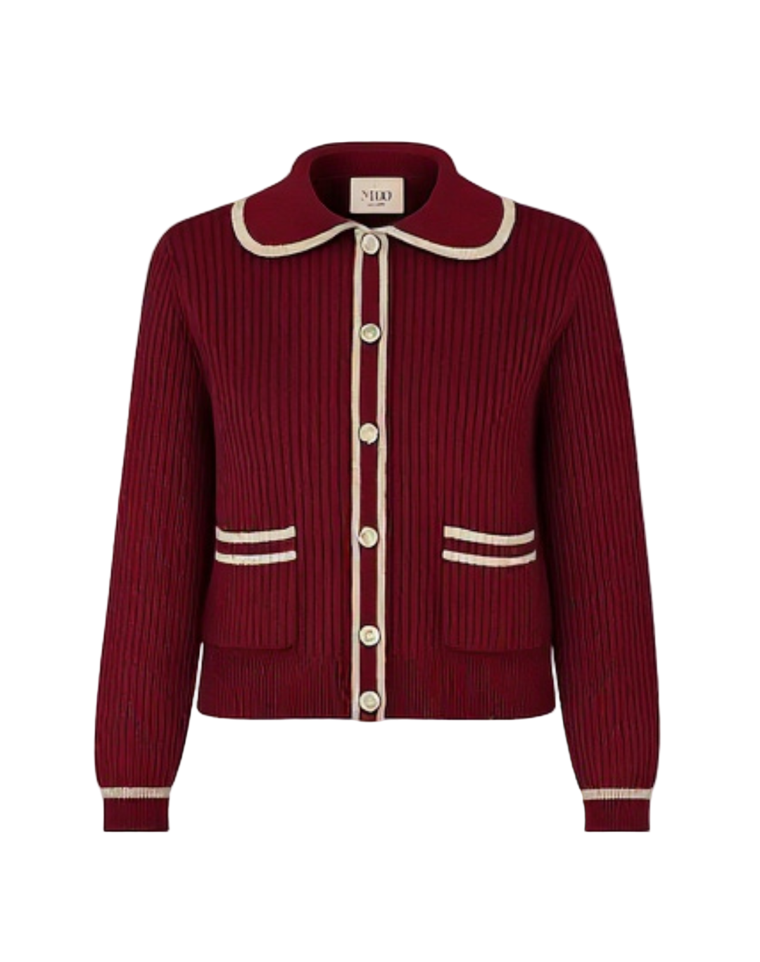The Cashmere Mix Cardigan in Burgundy & Pink by Mirla Beane is a soft knit cardigan crafted for versatile layering in a warm, autumnal palette.