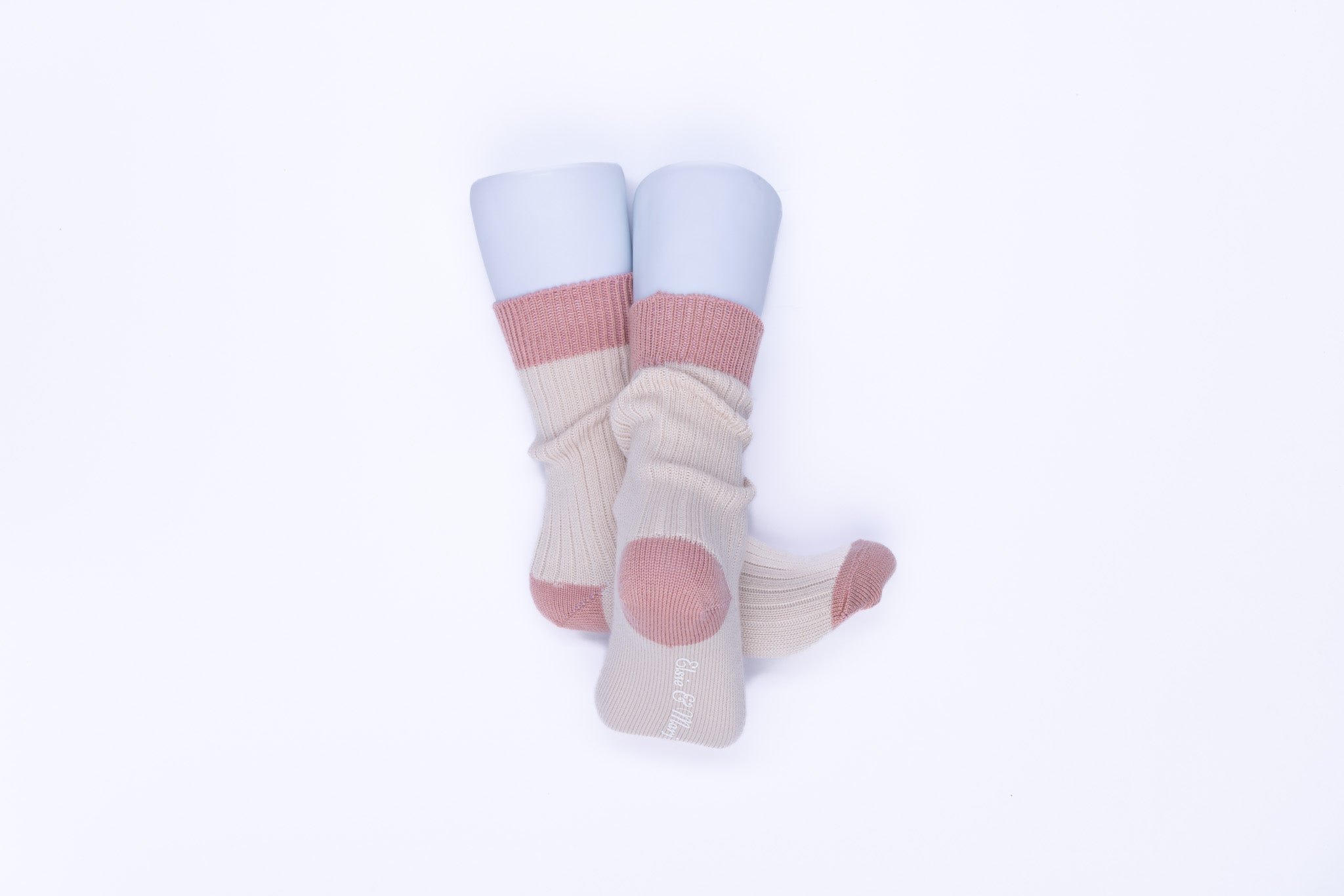 The Elsie Merino Wool Sock in Natural & Tea Rose by Elsie & Marj is a beautifully soft womens merino sock featuring elegant contrast toe and heel detailing in a warm Tea Rose shade.