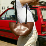 Spacious brown leather tote bag crafted from upcycled leather, ideal for everyday use