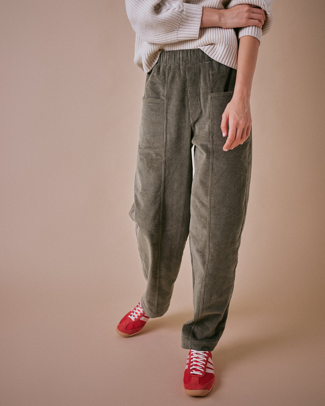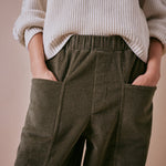 Expertly crafted in Portugal, these green cord trousers feature a soft textured finish with subtle seam detailing. The barrel leg design adds gentle structure while keeping a laid-back, effortless feel.