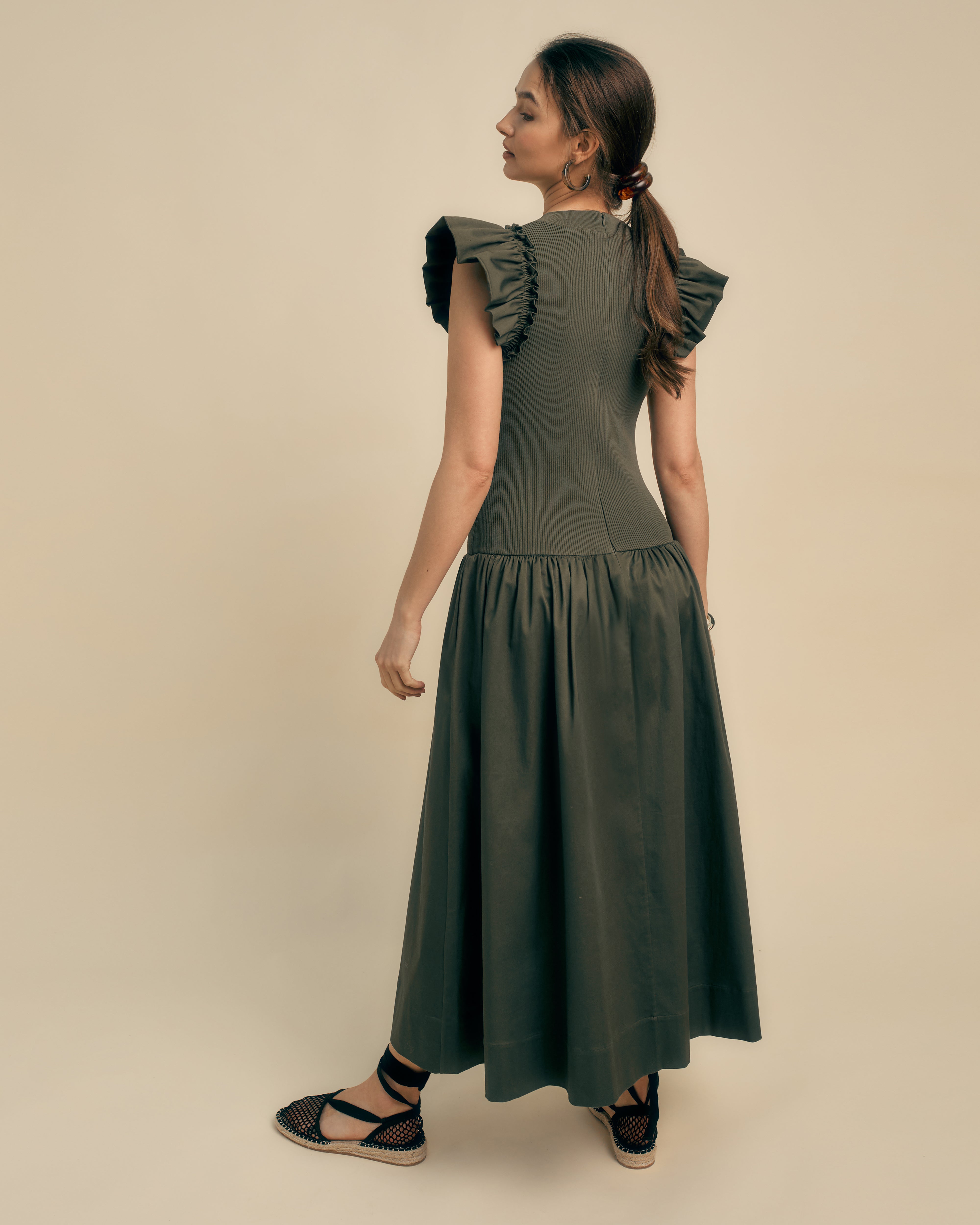 This drop waist midi dress is a modern hybrid style designed to bring comfort and polish to everyday dressing. With its ribbed knit bodice and crisp cotton skirt, it creates a flattering fit-and-flare silhouette that feels easy yet refined. In khaki, this knit and cotton dress is a versatile wardrobe piece for work, weekends and beyond.