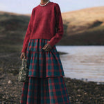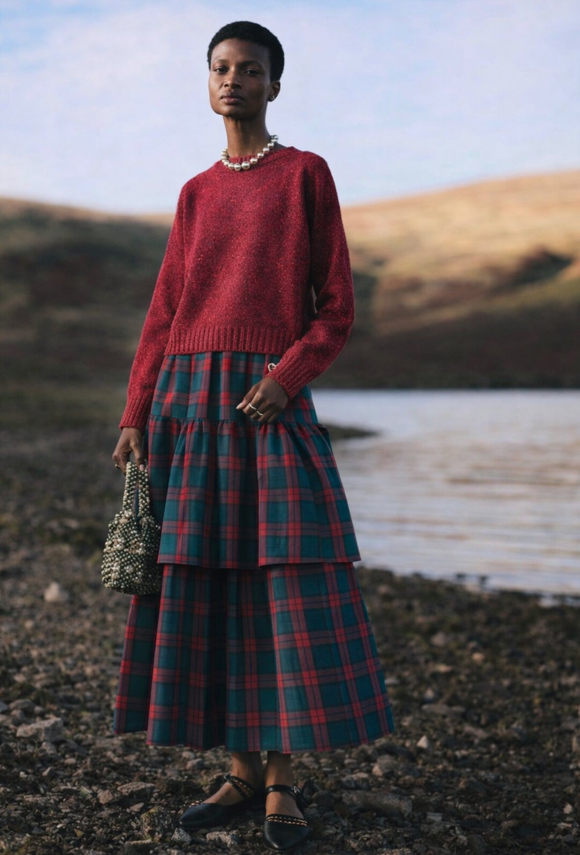 The Lottie Red Tartan Skirt by Minkie Studio is a beautifully crafted tiered midi skirt made in the UK from reclaimed deadstock cotton. Its soft-handle fabric and rich red and green check make it a timeless wardrobe favourite with a playful twist.