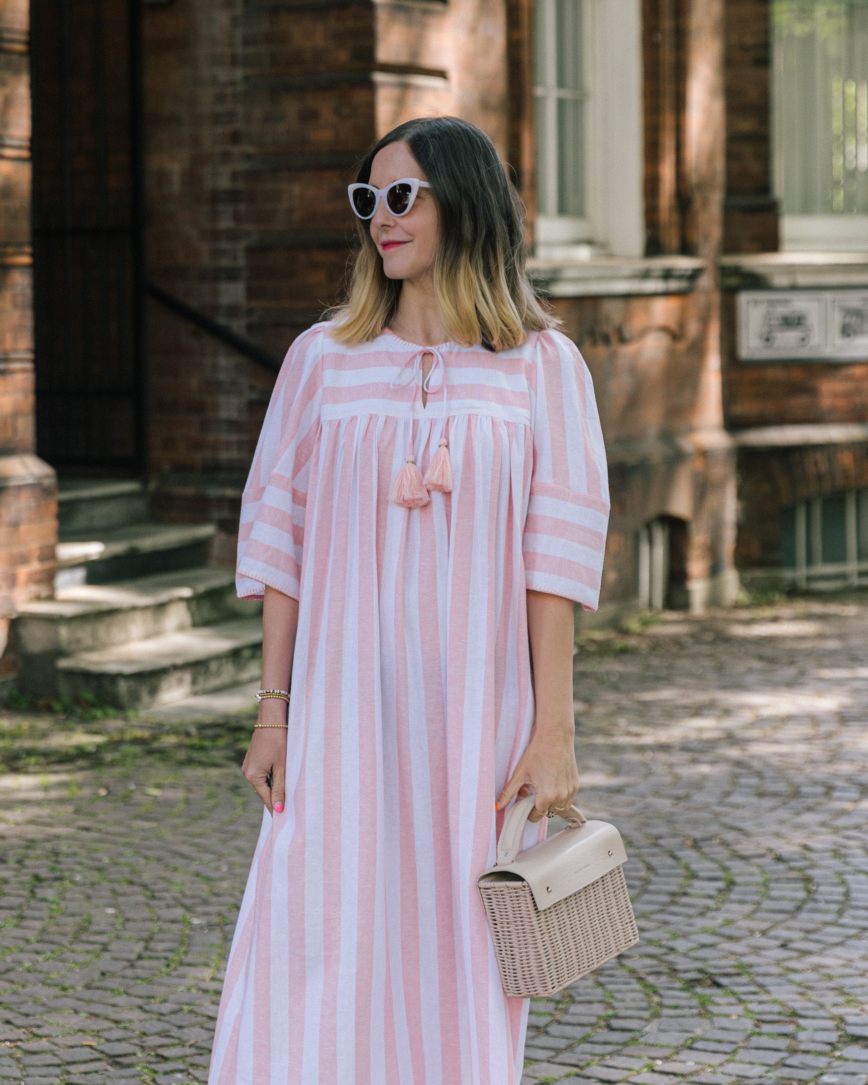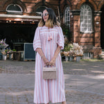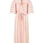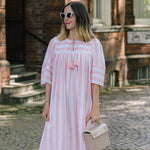Embrace the carefree 70's with the Margot Dress. This playful cotton dress boasts pink and white candy stripes and angel sleeves for a touch of femininity. The flowy fit and waist tie allow for a customizable and flattering look. Perfect for warm days, vacations, and casual gatherings.