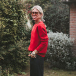 Bright red jumper with casual fit wool blend knit, vibrant red pullover ideal for cosy layering, ethically made sustainable knitwear, warm wool blend fabric