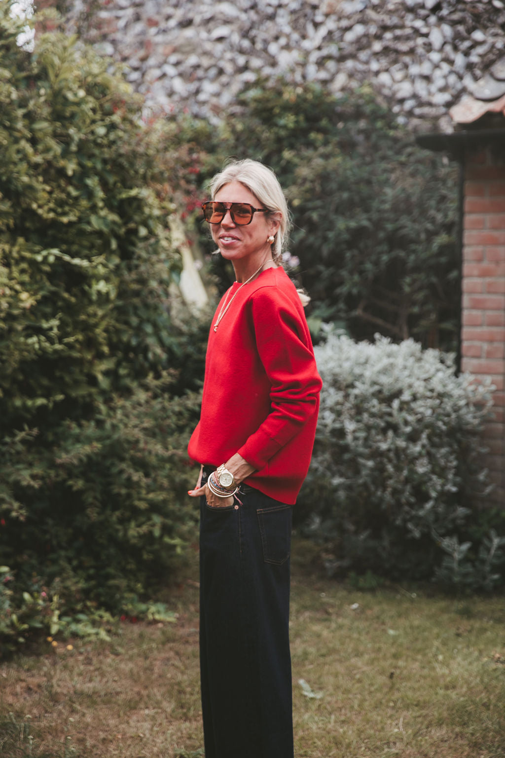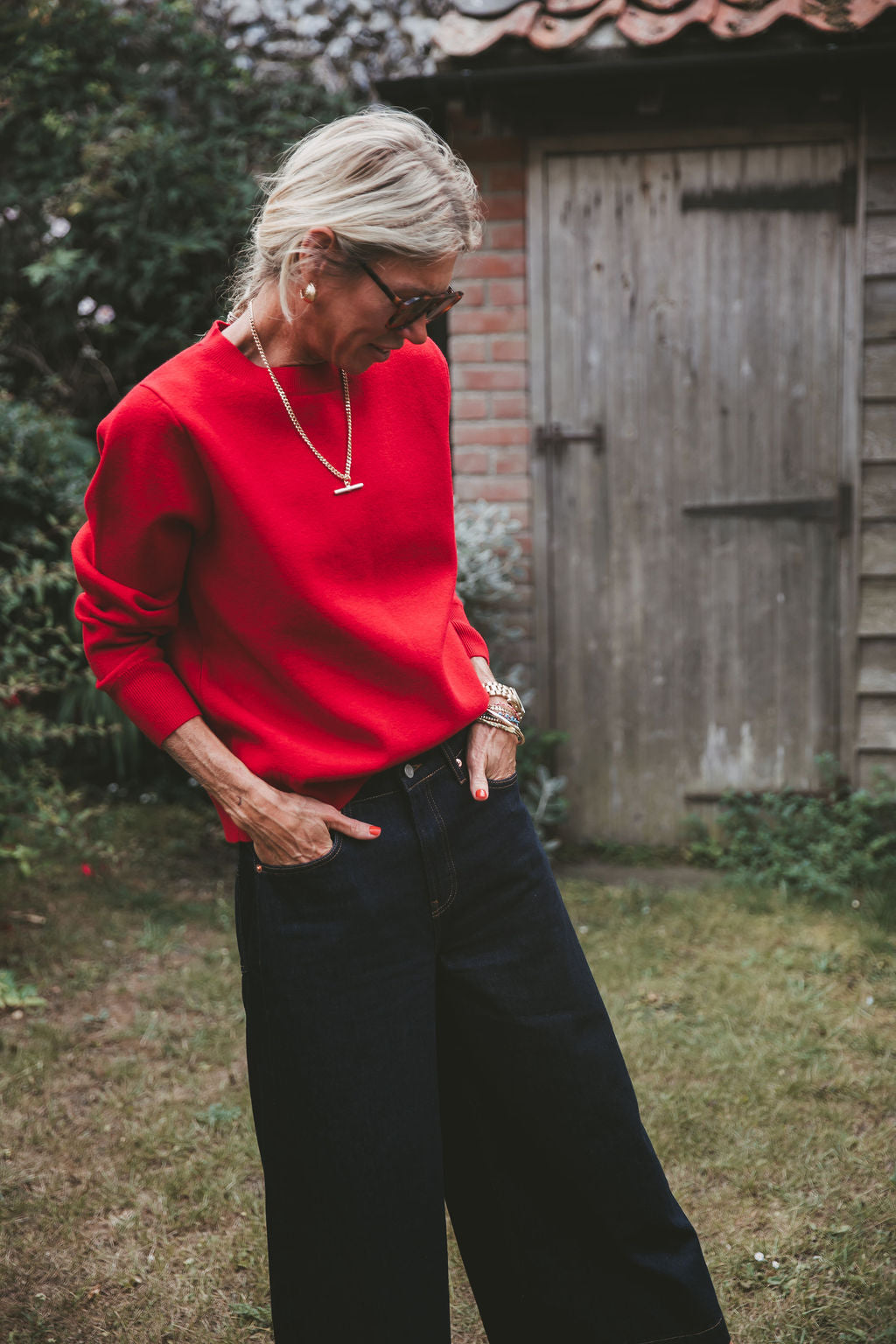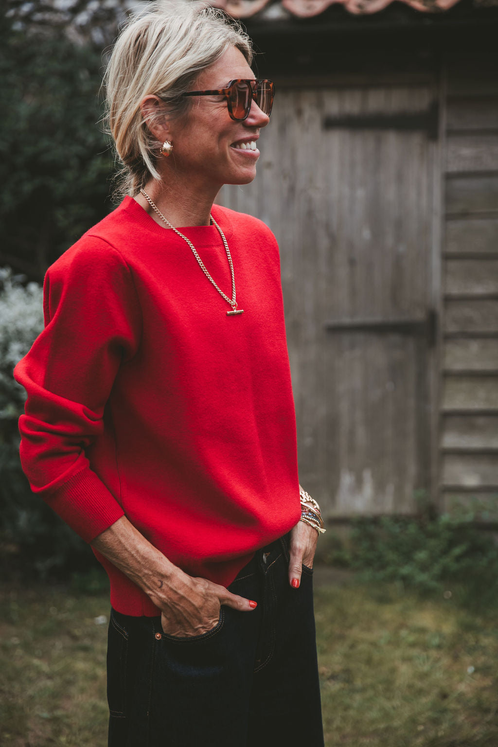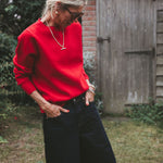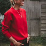 Bright red jumper with relaxed fit wool blend knit, soft and cosy wool sweater perfect for winter layering, sustainable and eco-friendly wool blend knitwear
