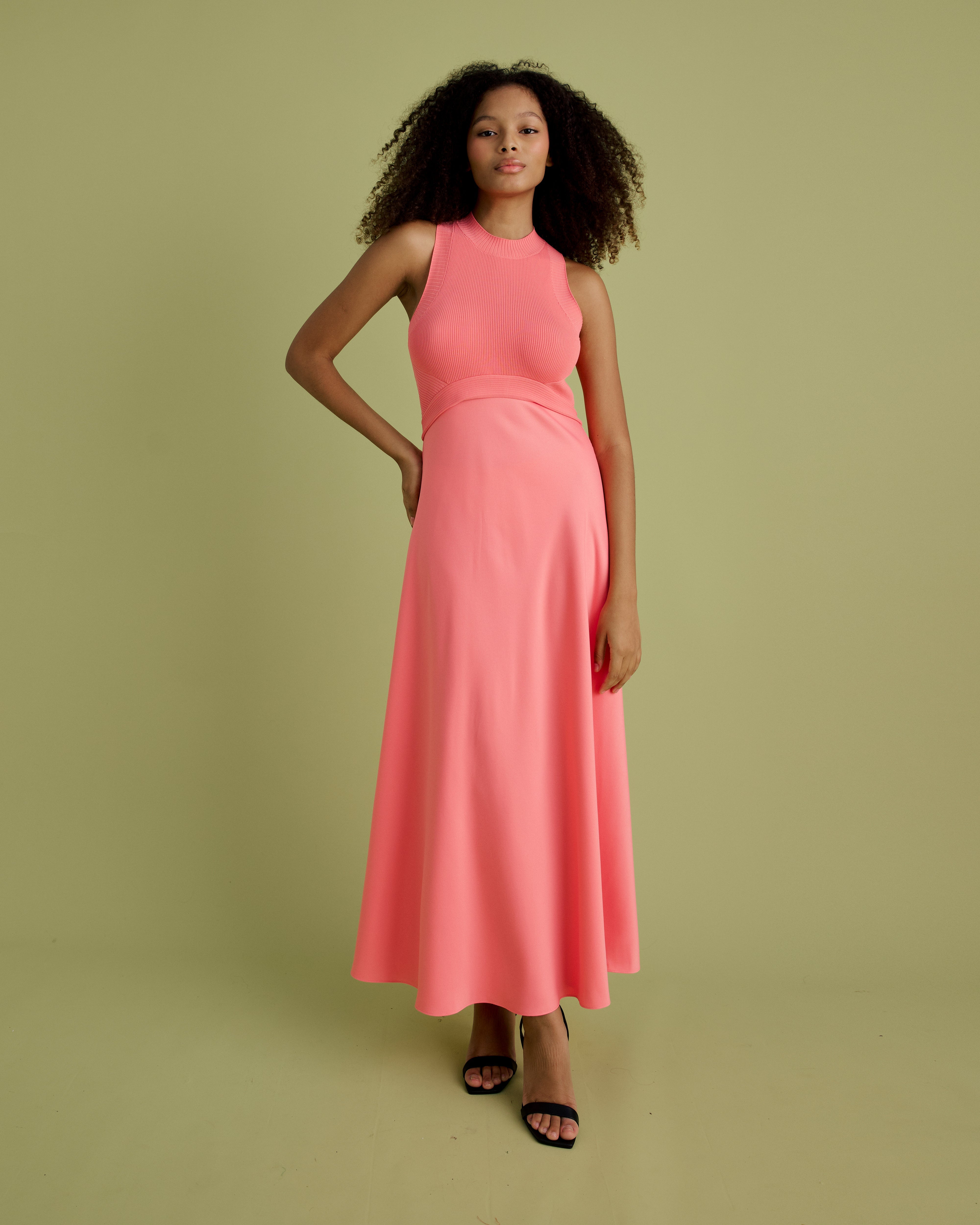 This satin mix midi dress is a refined hybrid style designed to flatter with minimal effort. Combining a fitted knit bodice with a fluid satin skirt, it creates soft structure and graceful movement in equal measure. In pink, this satin midi dress is an elegant option for occasions, evenings and elevated day-to-night dressing.