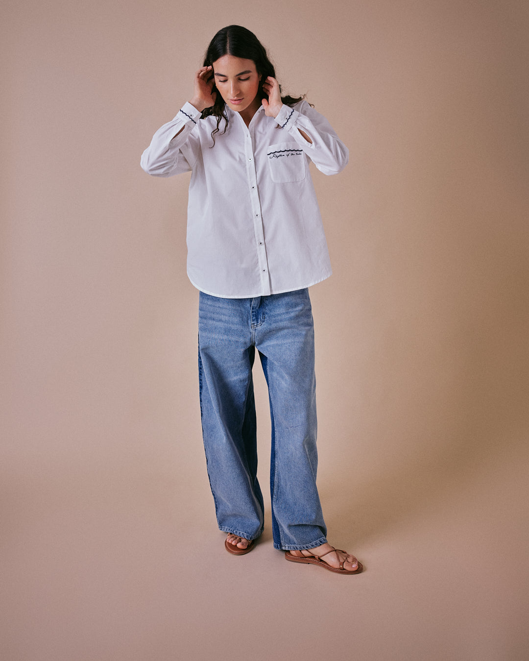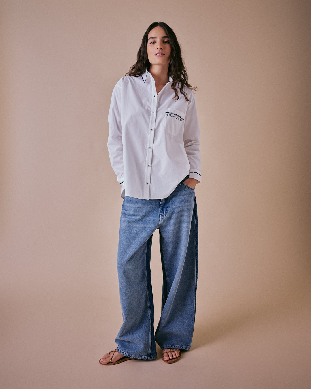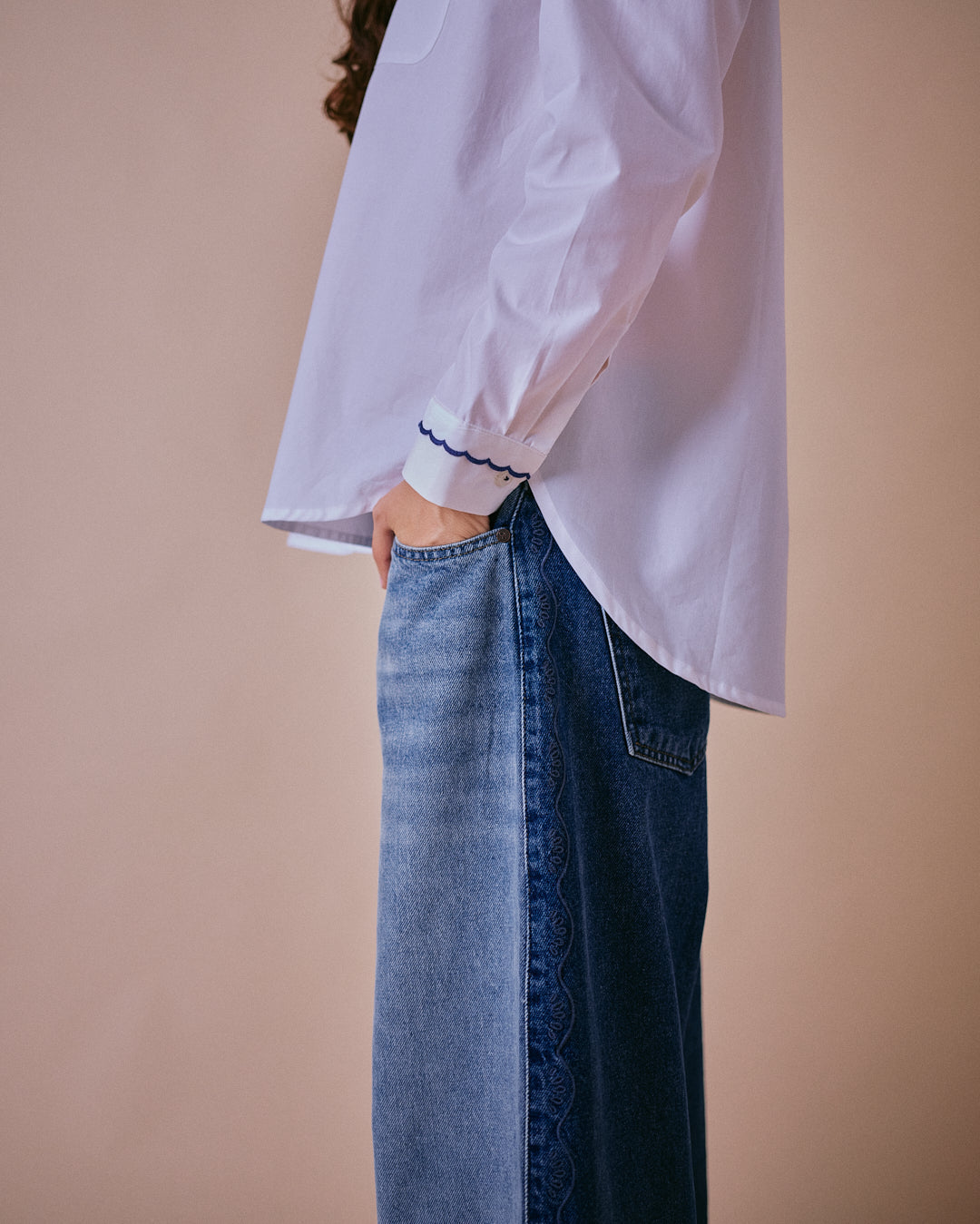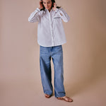 The Rythmn Wide Leg Jeans by Cape Cove are a relaxed, two-tone denim style featuring beautiful embroidered wave patterns along the side seams - a design inspired by the rhythm of the tide and Cape Cove's coastal roots. Effortless, versatile and crafted for everyday comfort.