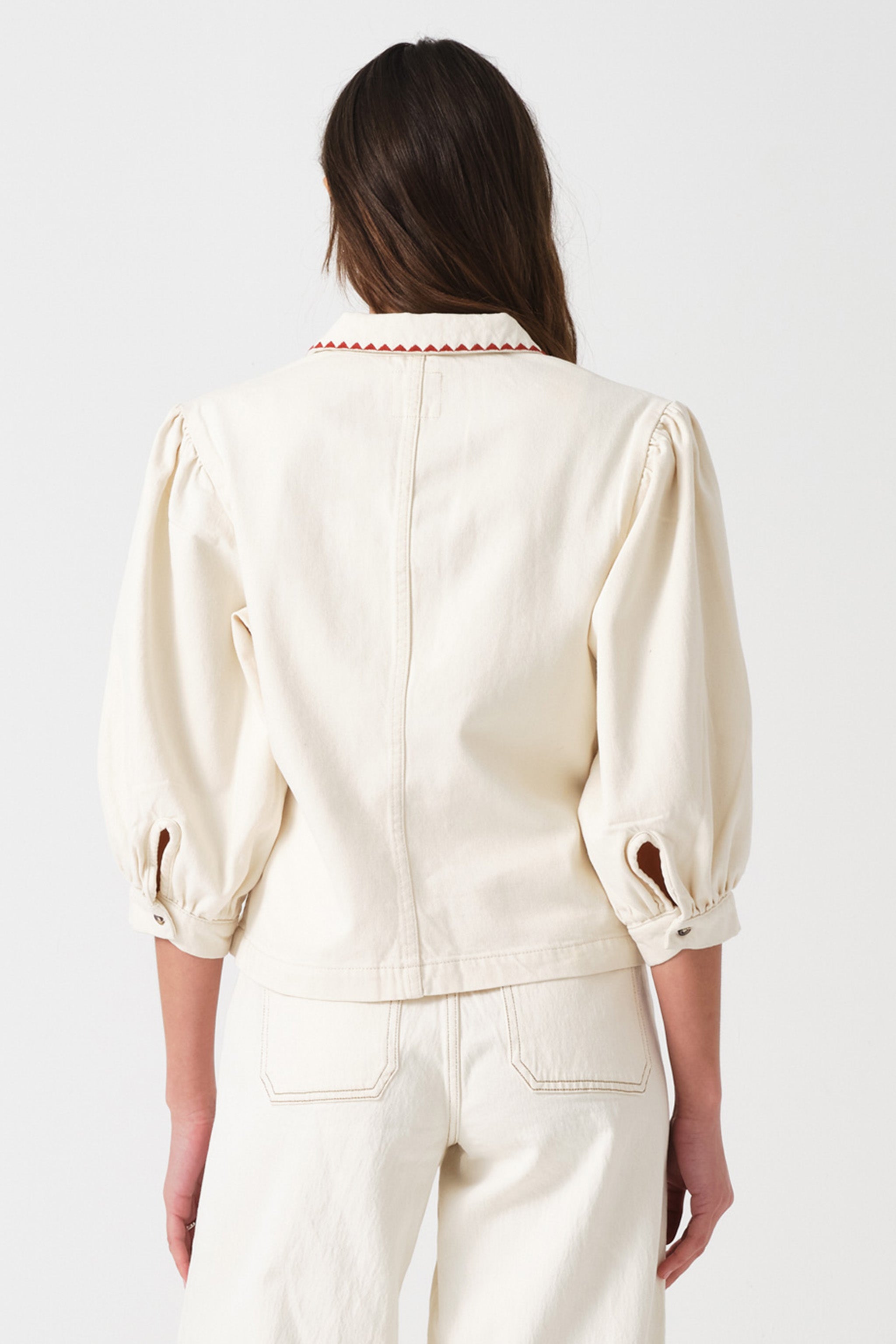The crisp ecru tone highlights the seamed detailing and classic button-down finish, giving this denim top a timeless, easy-to-style feel.